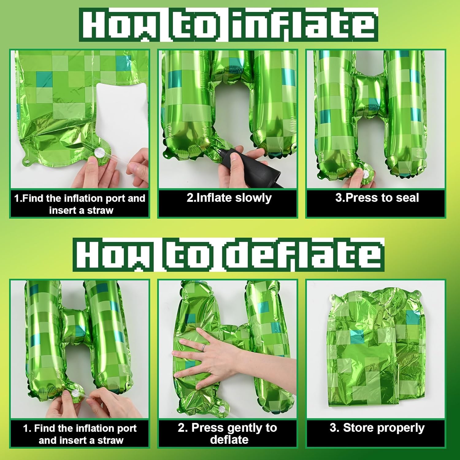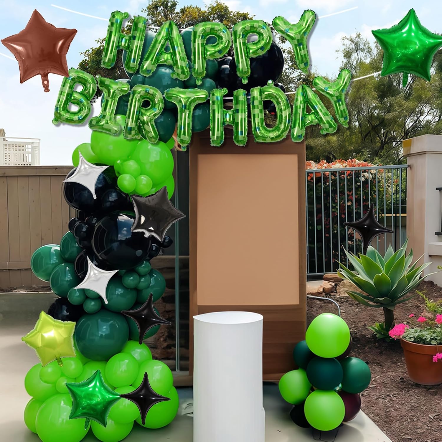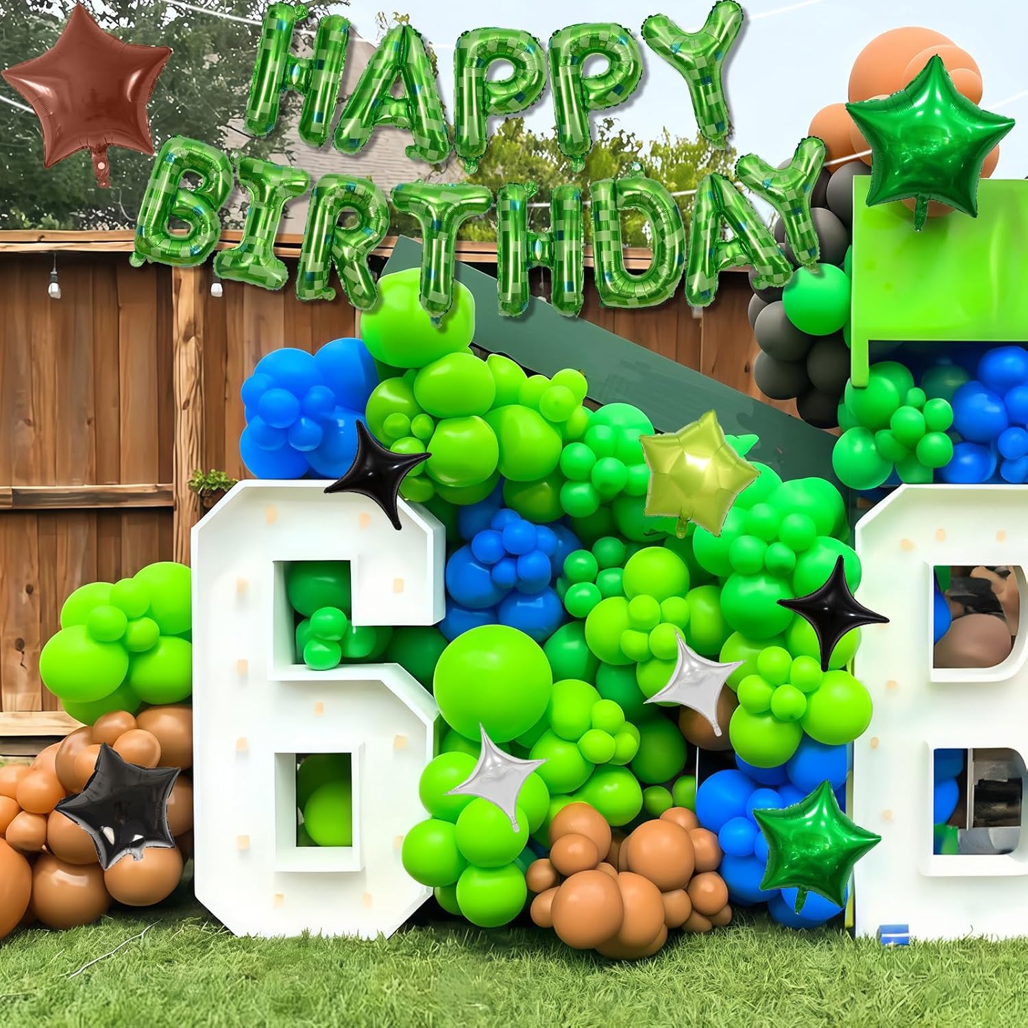 - Ultimate Pixel Party Decor – Create a retro gaming vibe with this complete set! Includes a 16" pixel green checkerboard "HAPPY BIRTHDAY" foil balloon, 18" dark green & brown star balloons, and 7 pixel-style star balloons (silver, black, green). Comes with ribbon, glue dots, and a straw for instant setup!