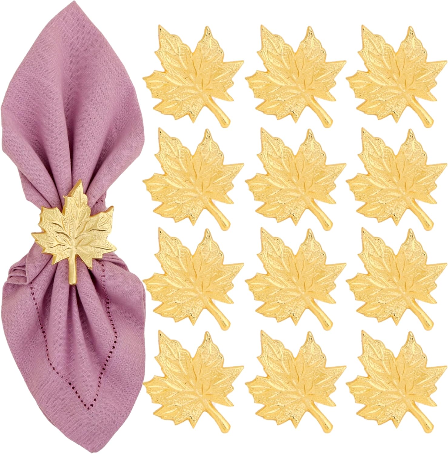 Set of 12 Maple Leaf Napkin Rings - Handcrafted Aluminum Napkin Holders for Cloth & Paper Napkins, Elegant Table Décor for Wedding Receptions Thanksgiving Christmas Holiday Parties (Gold) CLEENTABLE