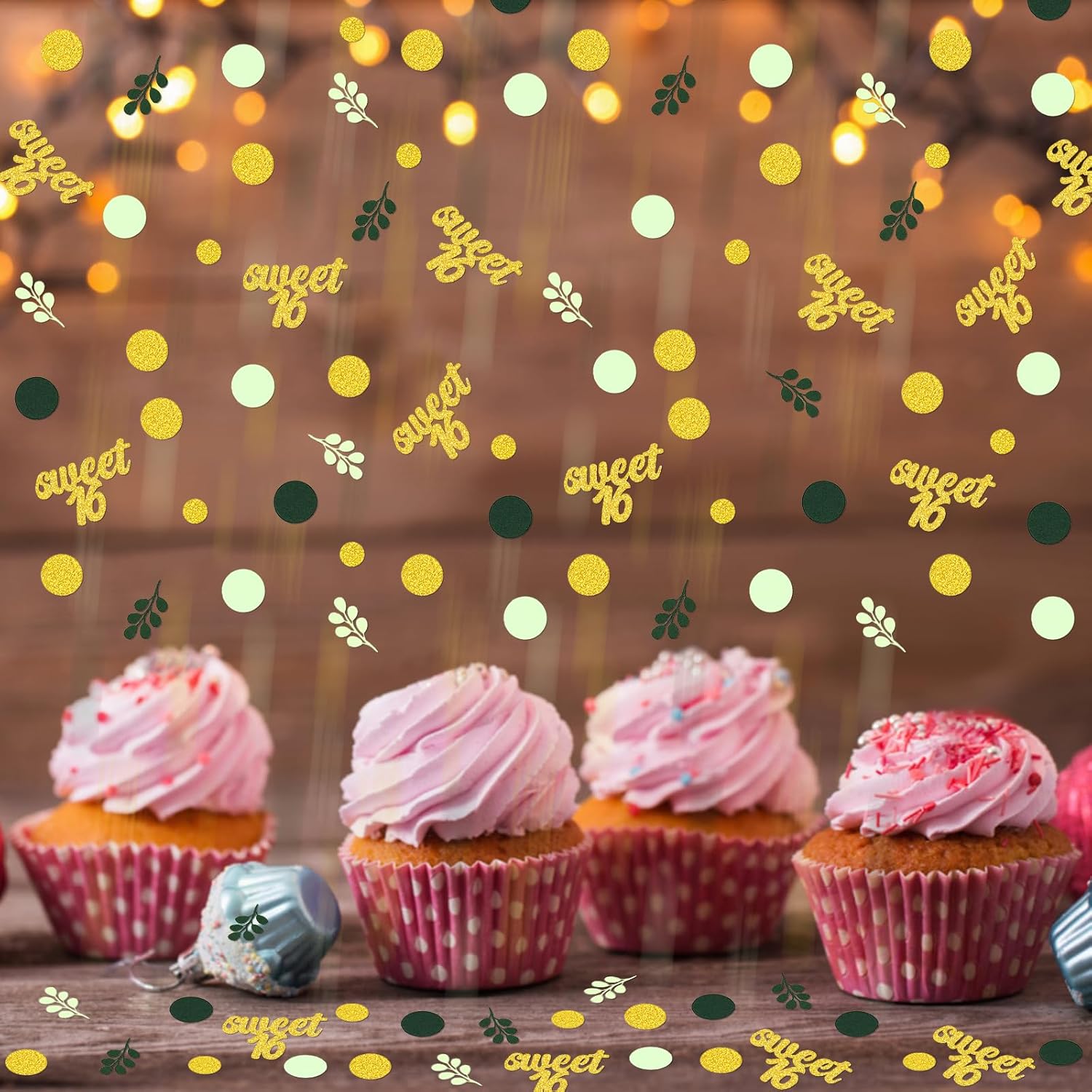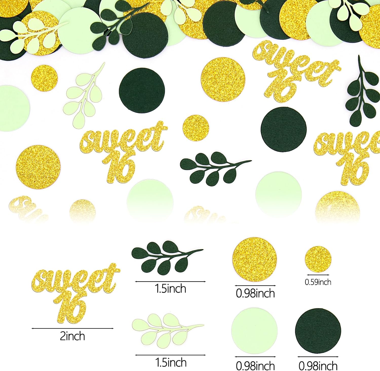 - 1.Great Addition to Sweet 16 Party.The green and gold circle dots with sweet 16 confetti scatter are shiny and fresh,very sparkle,a perfect addition to 16th birthday theme,nice green nature neutral boy/girls 16th birthday decorations.