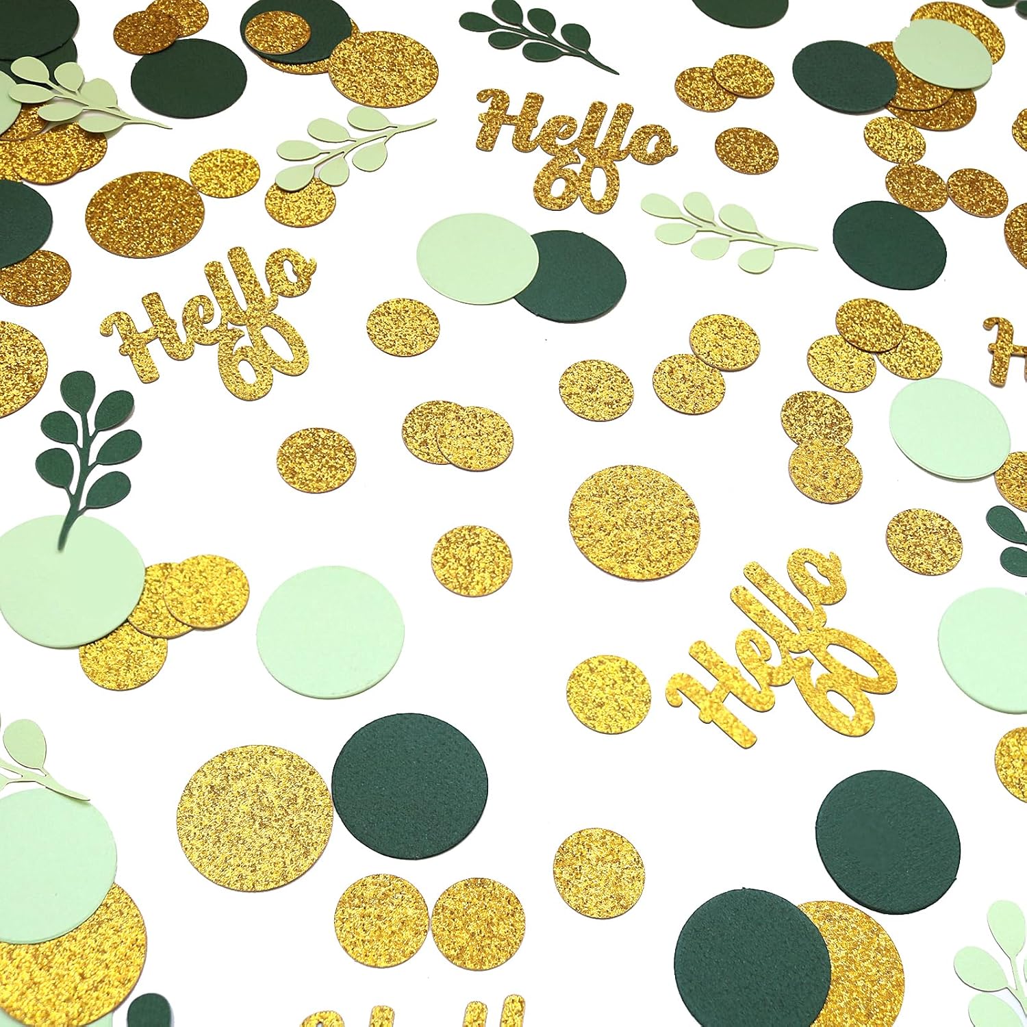 - 1.Great Addition to 60 Birthday Party.The green and gold circle dots with hello 60 confetti scatter are shiny and fresh,very sparkle,a perfect addition to 60th birthday theme,nice sage green 60th birthday decorations for women/men.