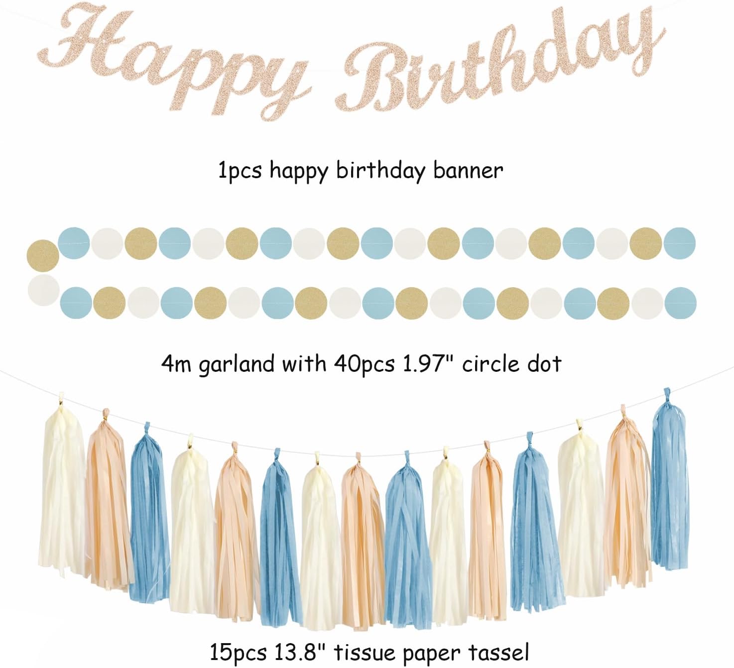 - Package Includes: This kits include 1pcs happy birthday banner, 1pcs circle dots paper banner, paper tassels party garland, 4pcs tissue pom poms flowers, 2pcs paper lanterns, 2pcs paper flower fans, 6pcs paper swirls hanging streamers in light dusty blue beige champagne colors, and different sizes