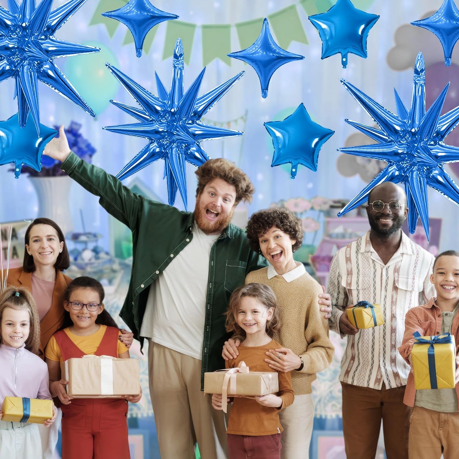 - Package: This set includes 6pcs 22inch blue explosion star foil balloons, 4pcs 10inch blue star foil balloons, 6pcs 10inch blue four angle star balloons, and a ribbon. Perfect for creating a dazzling party atmosphere.