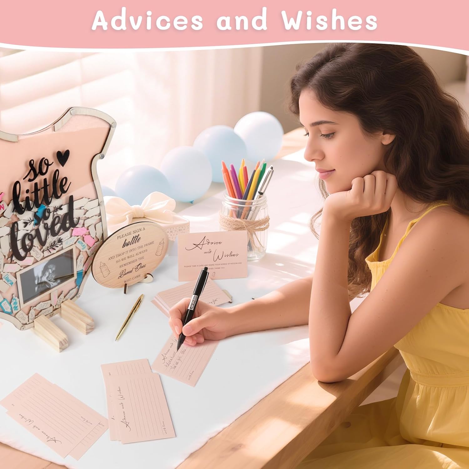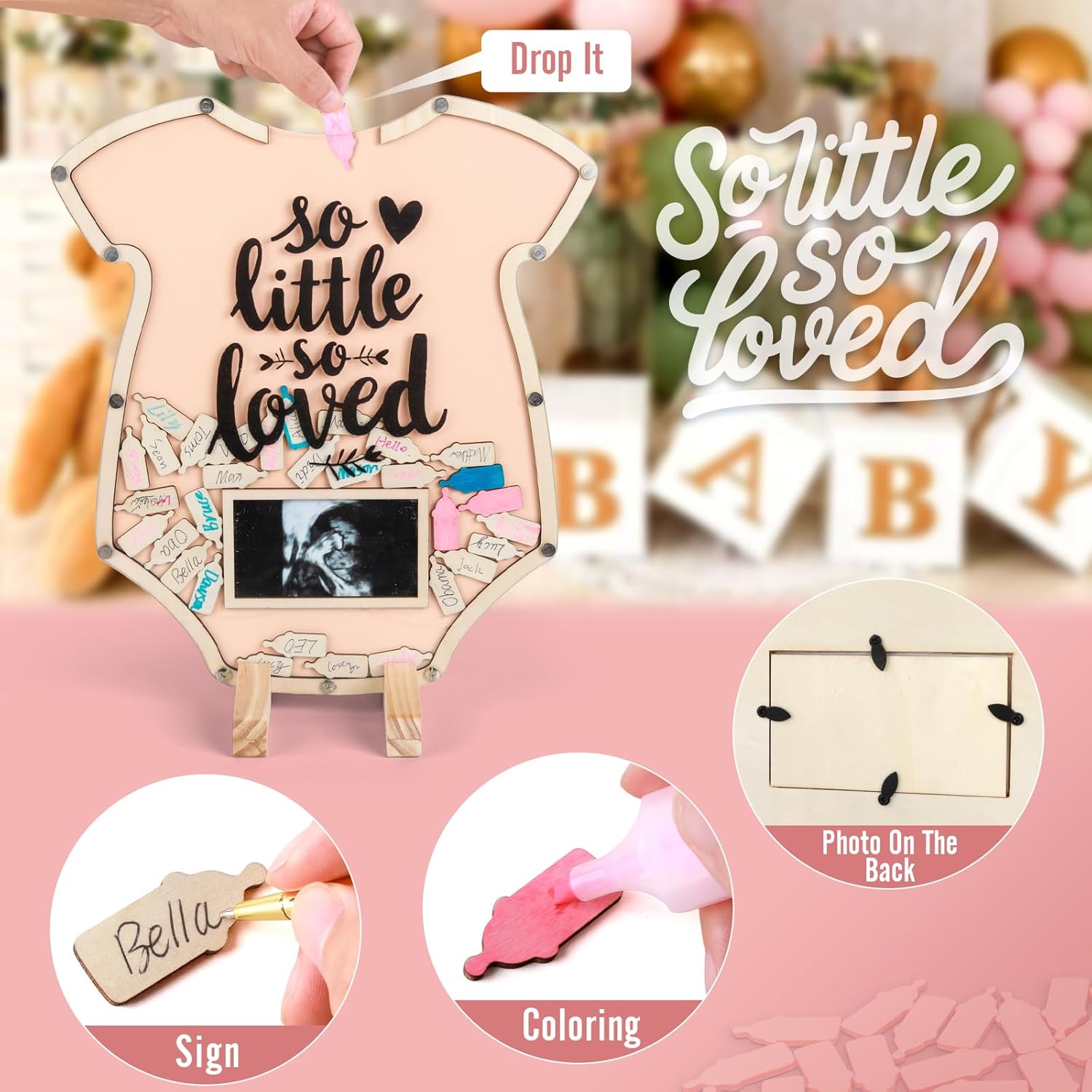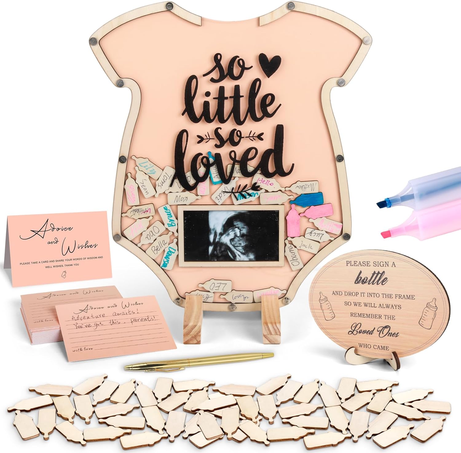 - 🌟 All-in-One Baby Shower Guest Book Set:Includes a wooden onesie-shaped frame with stand, 60 wooden bottle-shaped slices, 1 introduction card, 50 advice cards, 1 gold pen (black ink), drawstring cotton bags, and pink & blue markers — everything you need to create a memorable baby shower experience.
