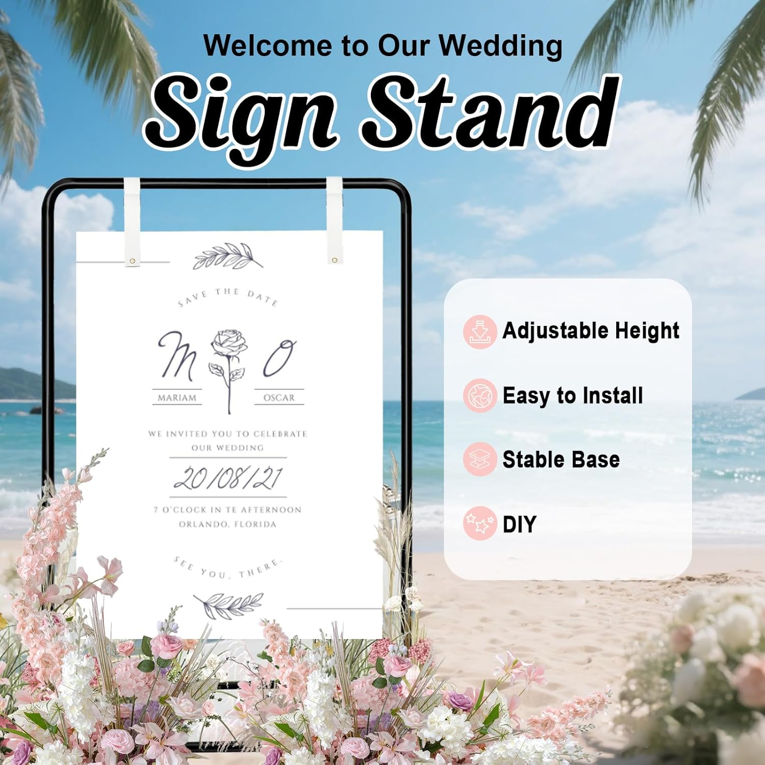 - PERSONALIZED WEDDING WELCOME SIGN HOLDER:Adjustable height. at 31" wide, this versatile easel stand for sign offers three height options: 38"or54" or 70", making it perfect for showcasing your welcome sign or a larger seating chart. celebrate Love Through thoughtful Details, let your guests feel your care from the very first moment they arrive. every second of your wedding deserves perfection, starting with this meaningful welcome sign that embodies joy.