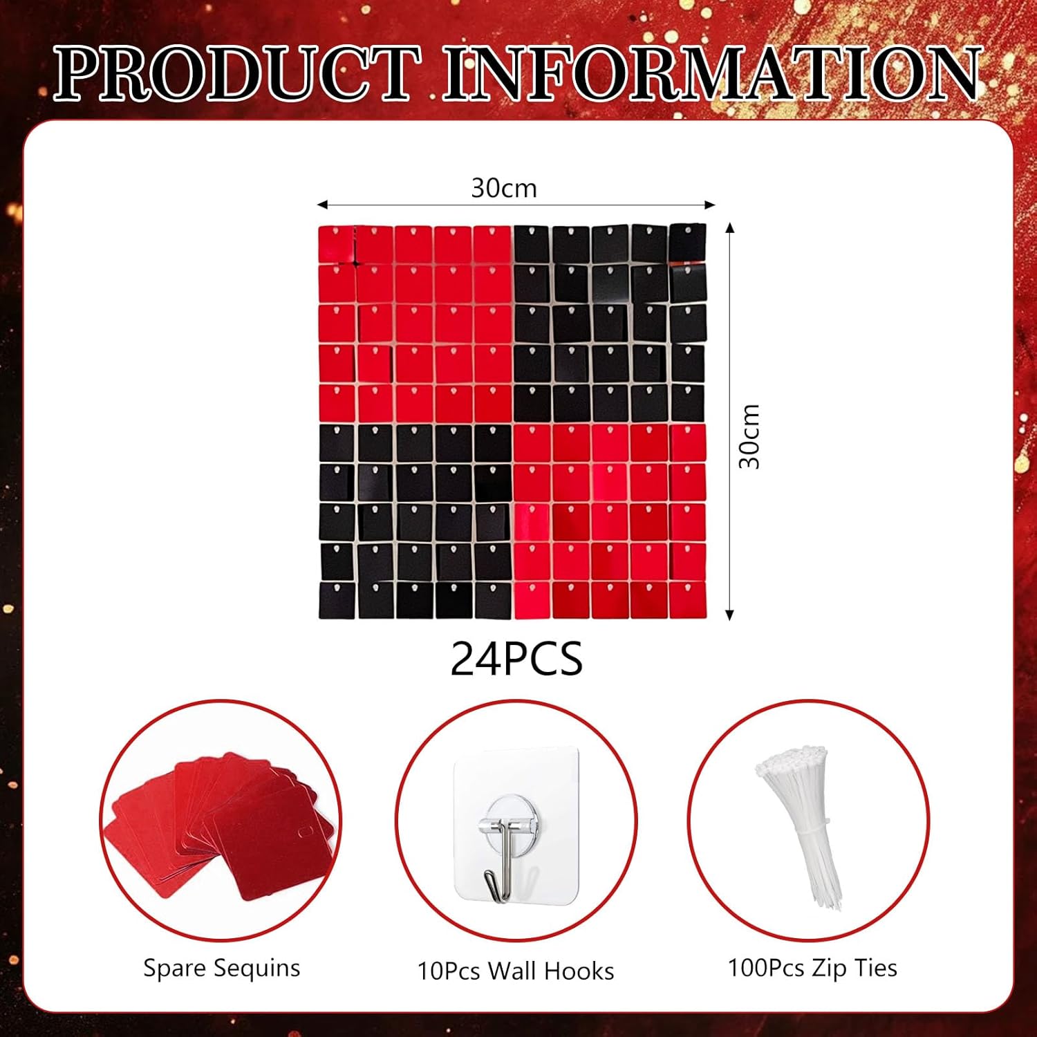24PCS Black Red Shimmer Wall Backdrop, Square Sequin Photo Backdrops Panel, Glitter Wall Background for Birthdays, Weddings, Christmas, Halloween, Disco Bachelorette Party Decor (4FTx6FT)