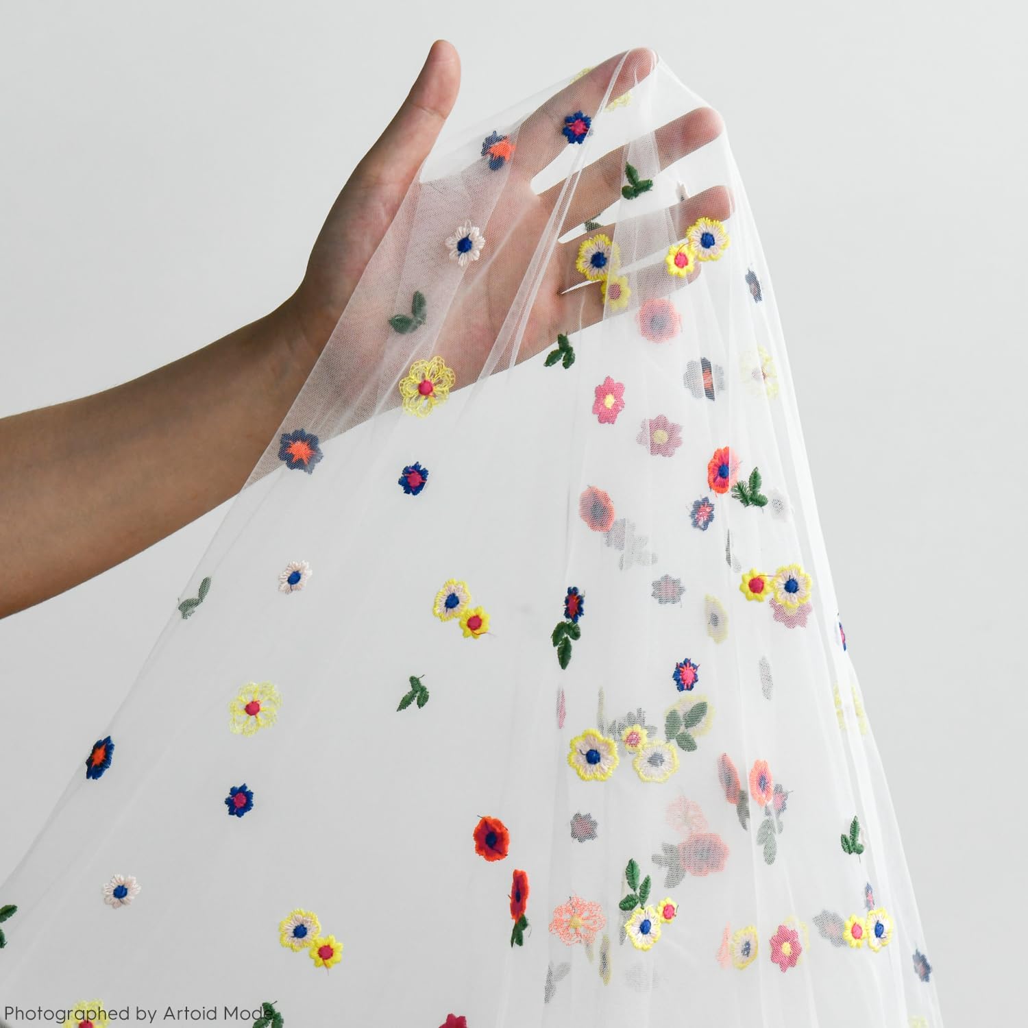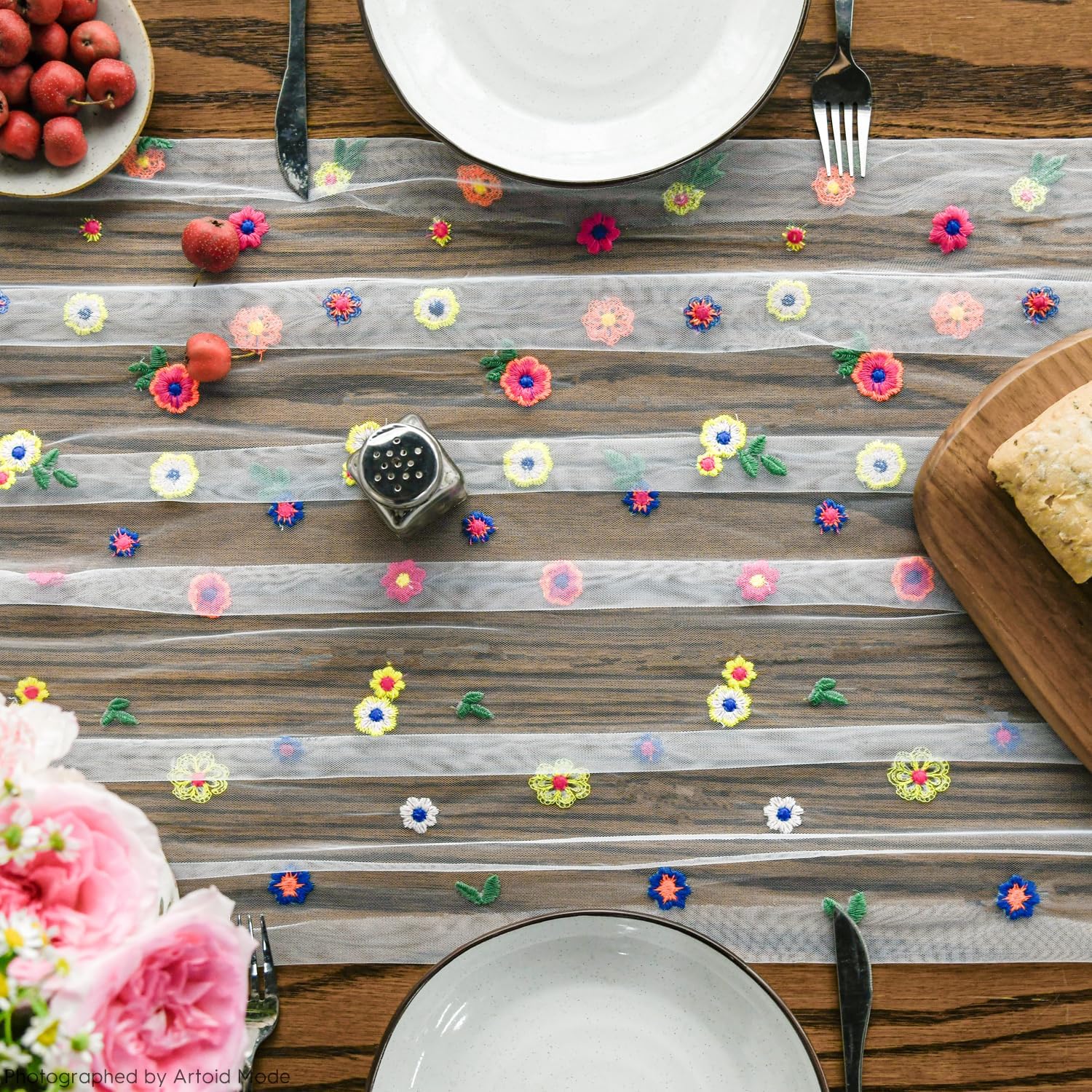 Artoid Mode 6PCS Embroidery Daisy Gauze Table Runner 120 Inch 10FT, Seasonal Sheer Kitchen Dining Holiday Wedding Birthday Table Decor for Home Party