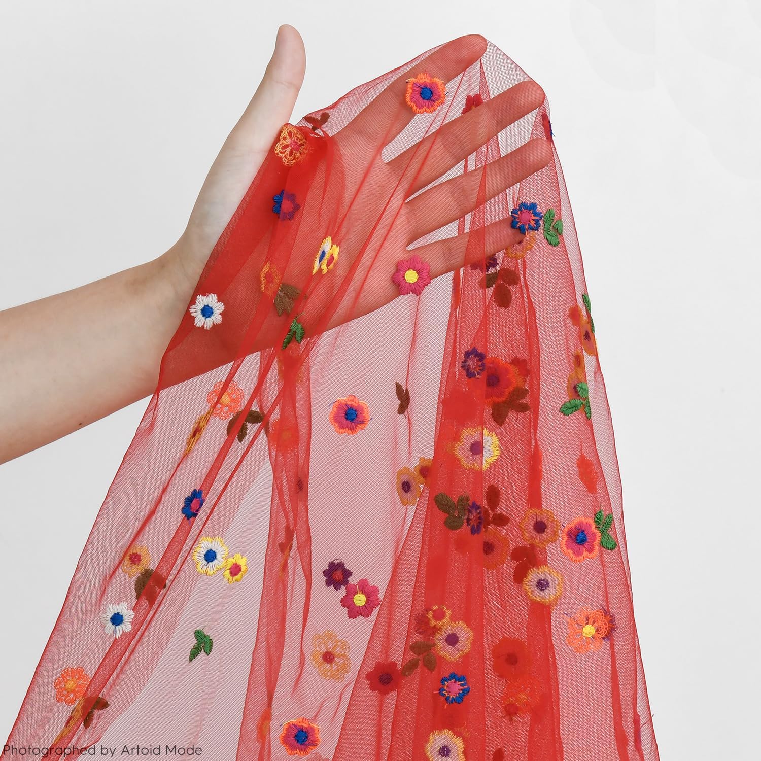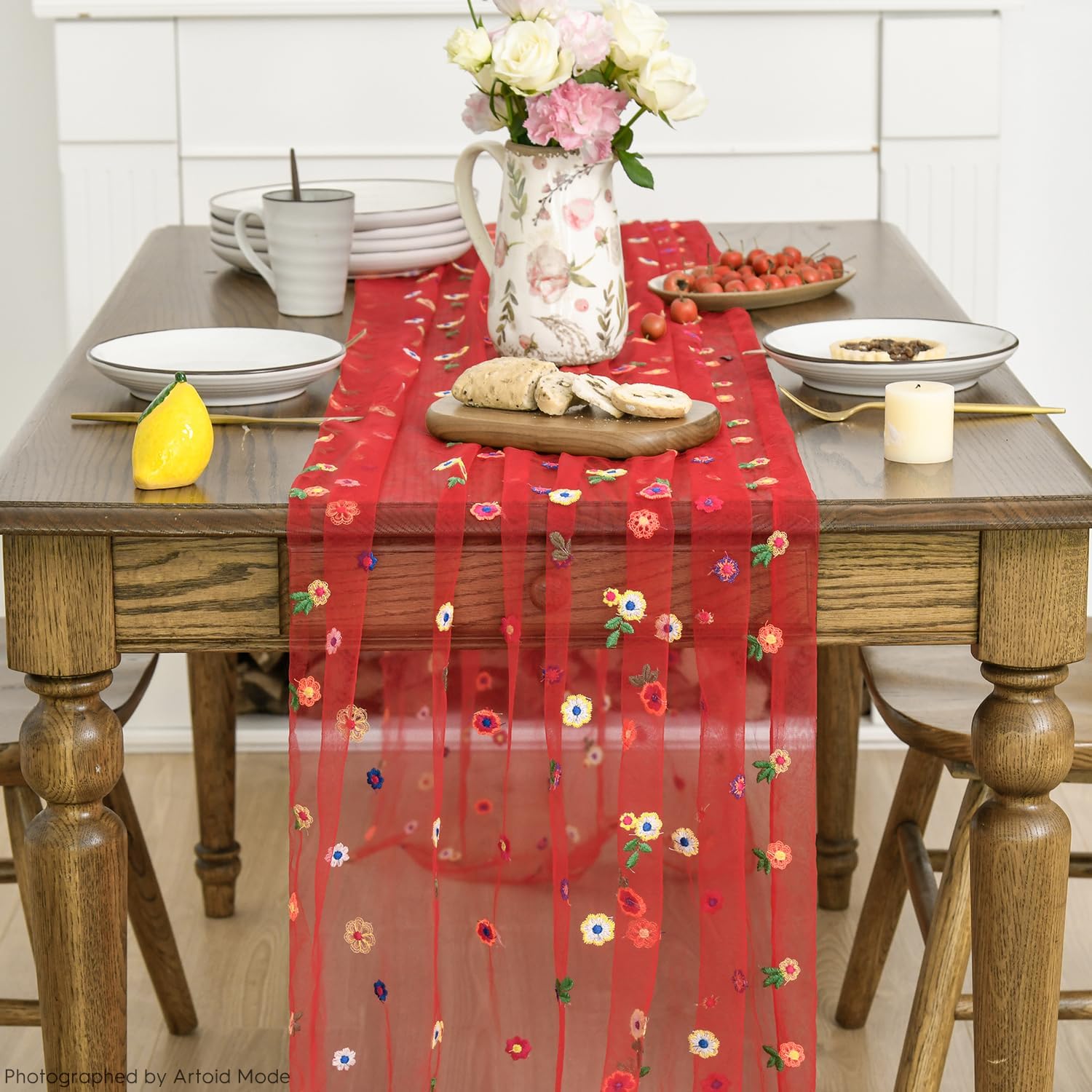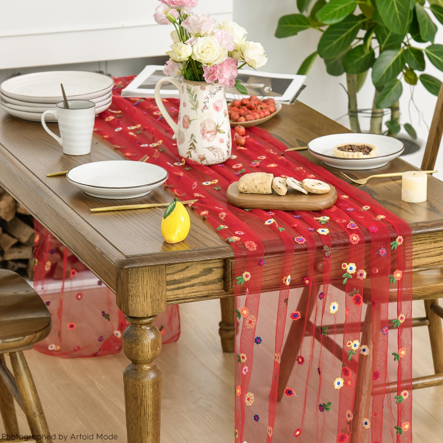 Artoid Mode Red Embroidery Daisy Gauze Table Runner 120 Inch 10FT, Seasonal Sheer Kitchen Dining Holiday Wedding Birthday Table Decor for Home Party