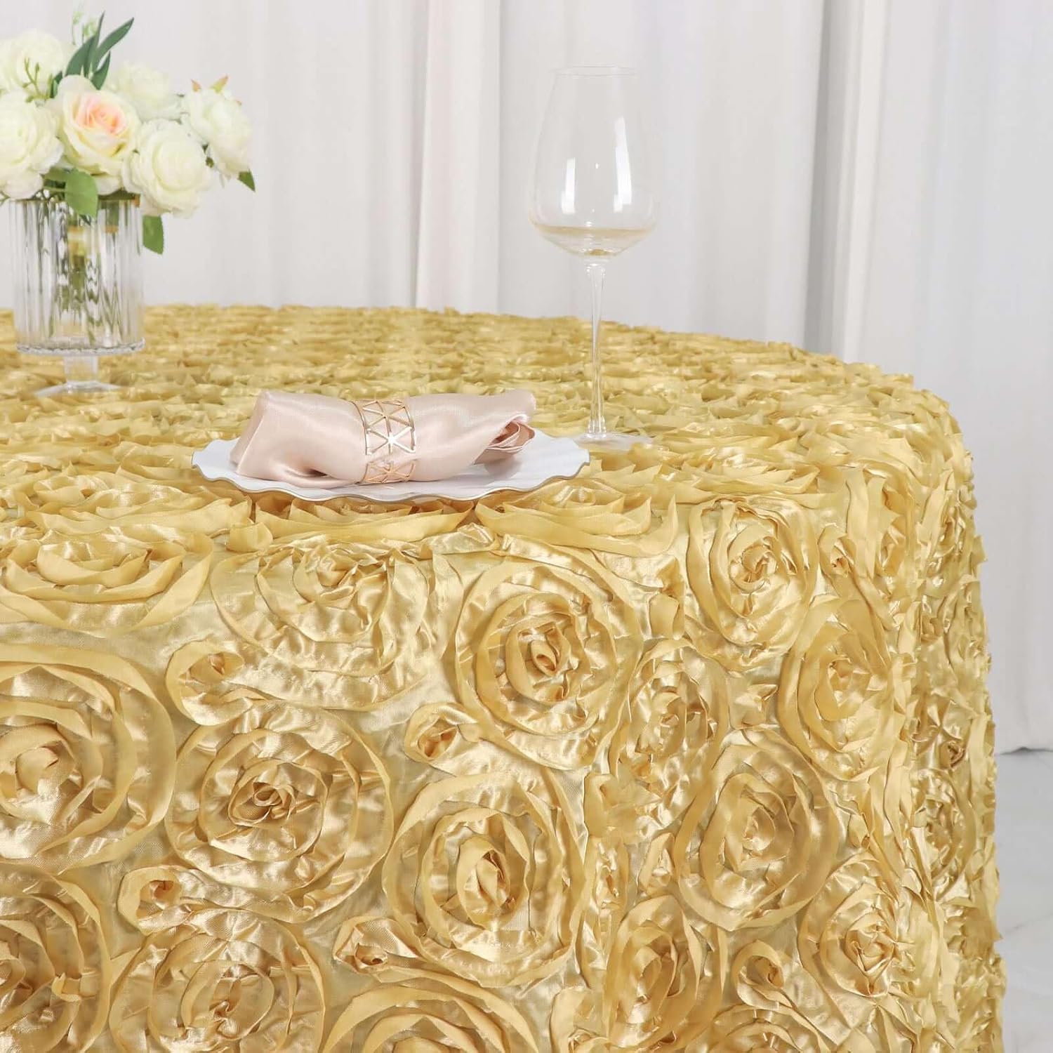 Efavormart 120" Wholesale Round Table Cover Champagne Grandiose Rosette 3D Satin Tablecloth for Wedding Party Event Decoration