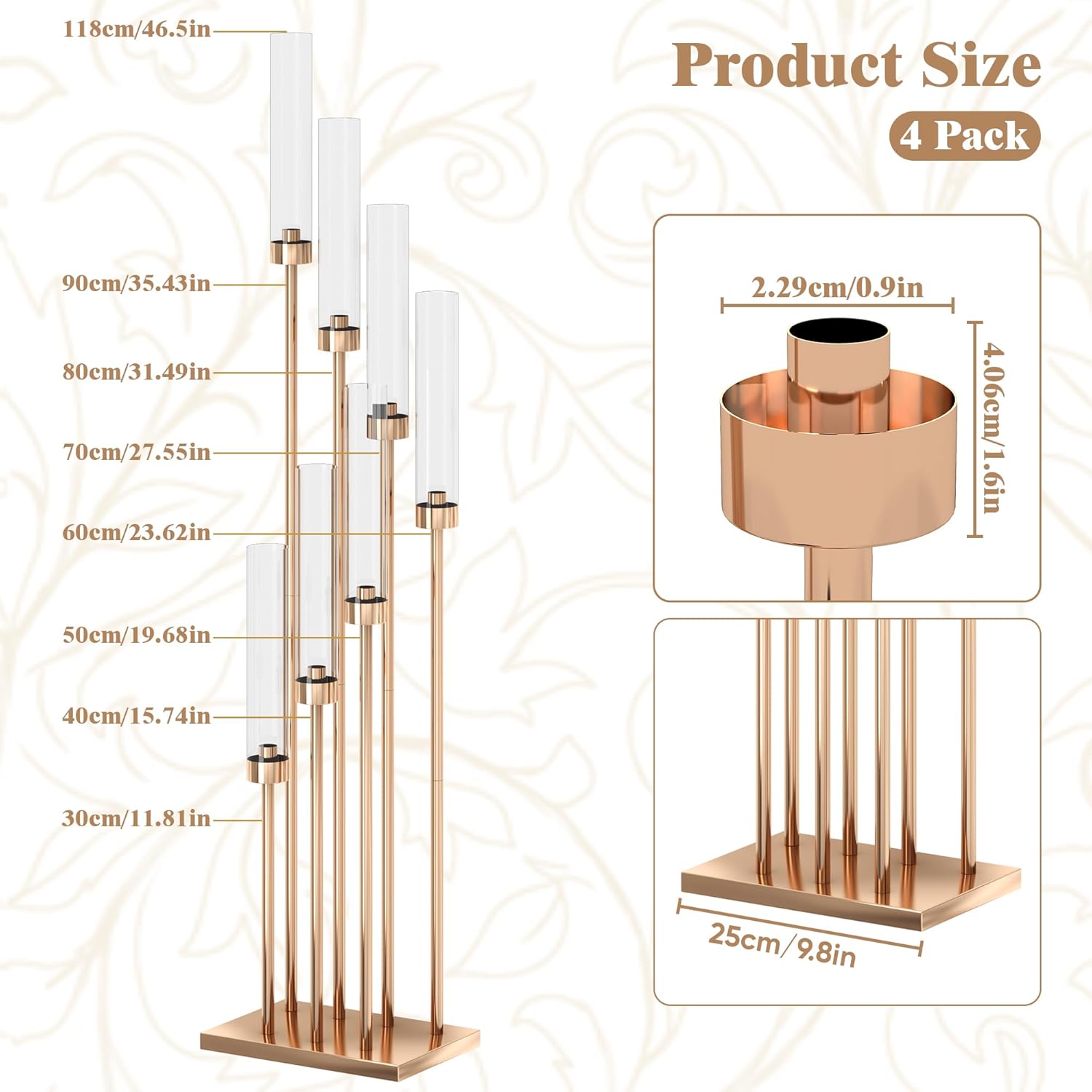- UNIQUE DESIGN: Our 4pcs floor candle holders for wedding is 7 heads, the whole is arranged from high to low, staggered, very unique, the appearance is golden, elegant and noble. Note: Our products feature a protective film on the bottom. Simply peel it off to reveal the gold finish. This film is included to prevent scratches on the product