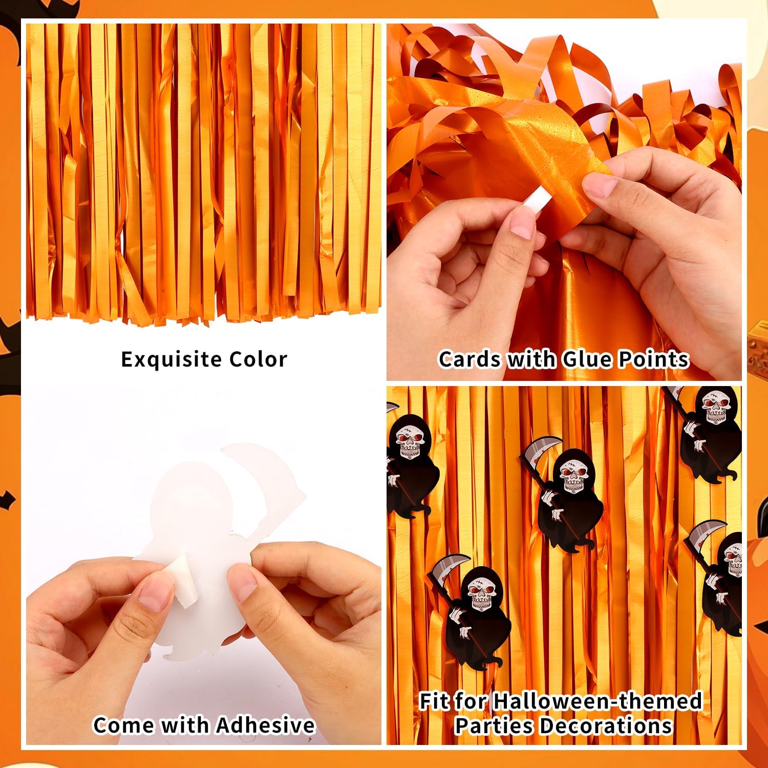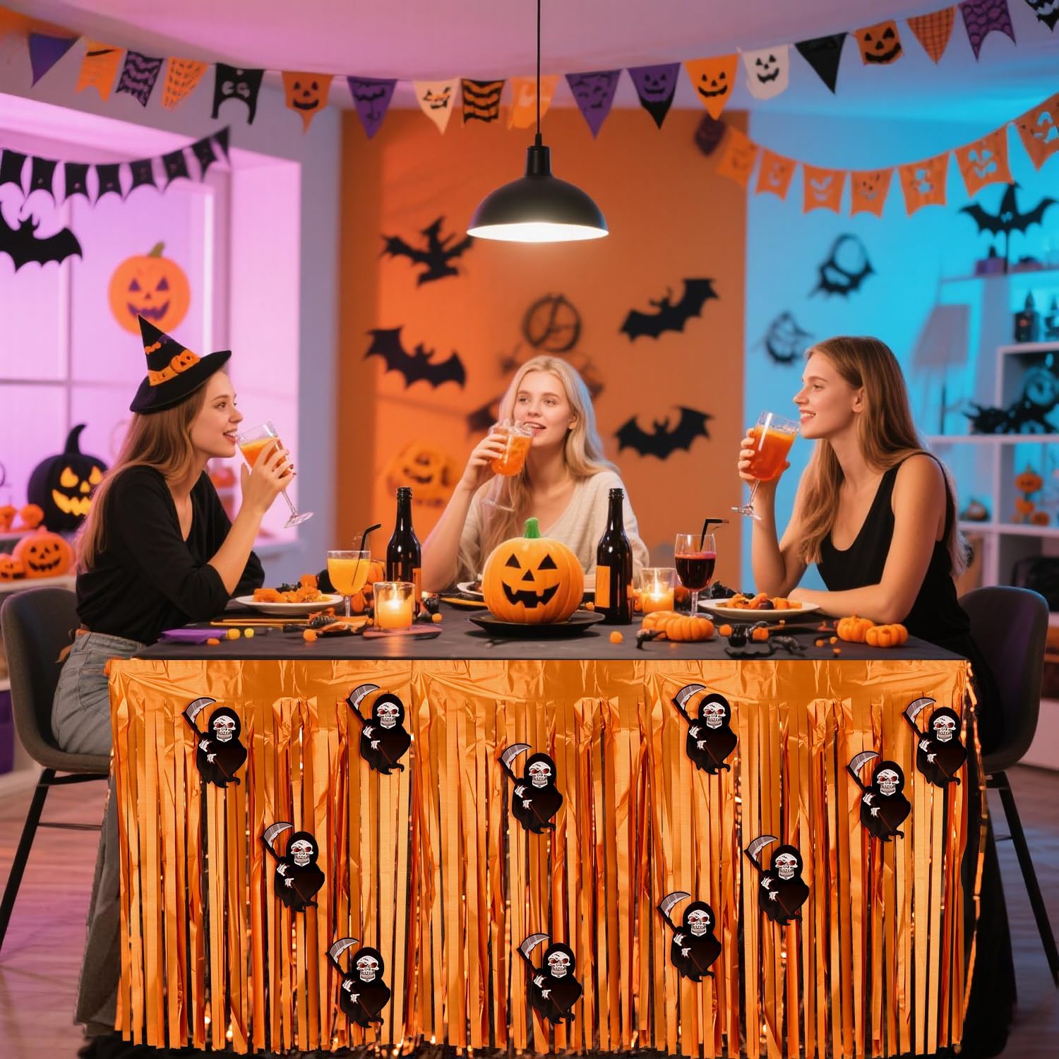 - Multi-color options: the orange table cover with skull decorations is shiny and bright. The foil fringe table skirts provide a variety of color options, to meet different halloween atmosphere needs. The orange table cloth adds a mysterious touch to halloween.