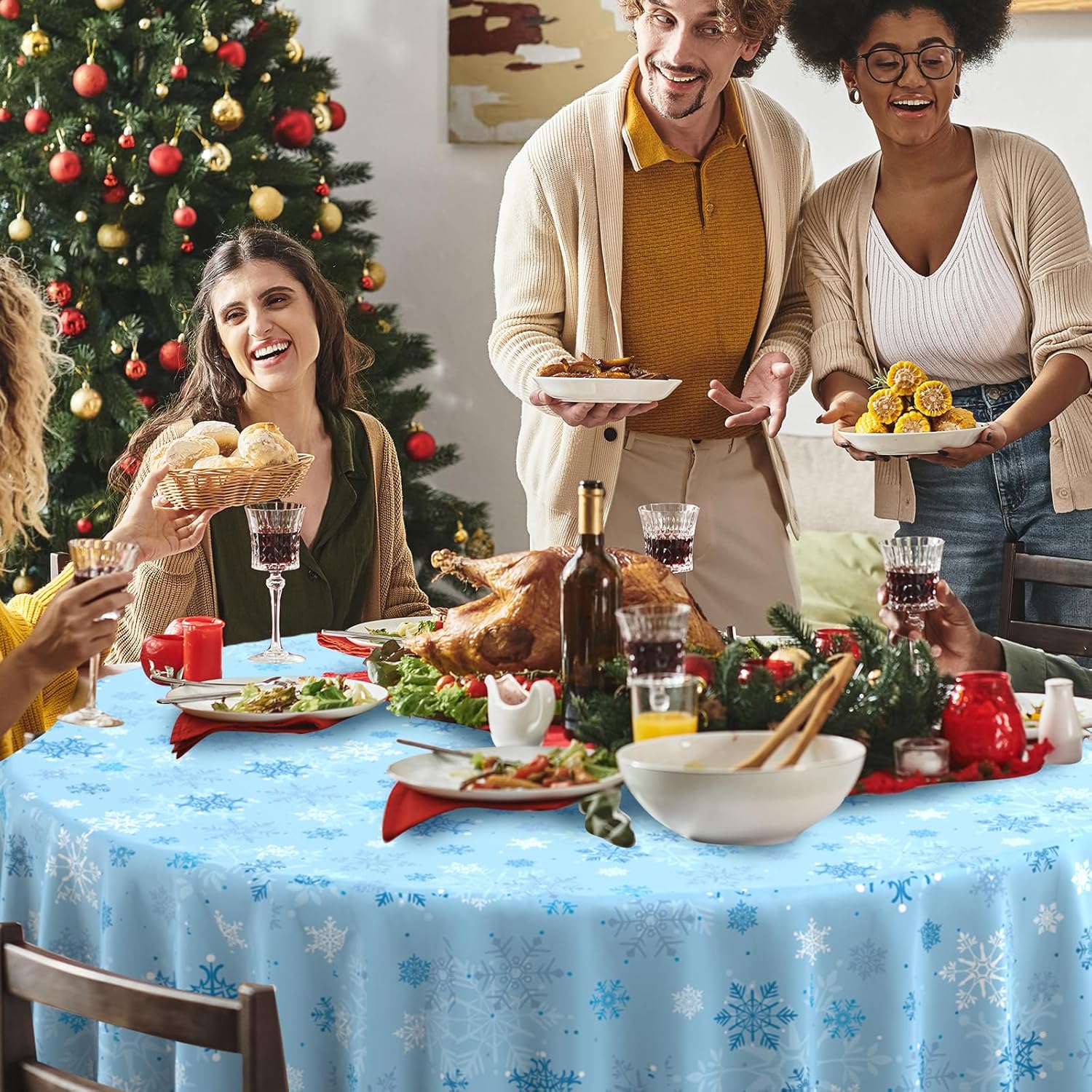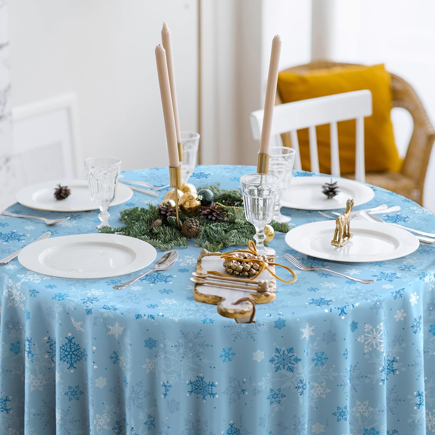 - Extra large size: these white light blue snowflake Christmas party tablecloth measures approx. 84 inch, which fits for various-sized tables that can accommodate 8-10 people, Itโs large enough for your to hold a winter holiday and Christmas theme party with your family and friends to share happiness