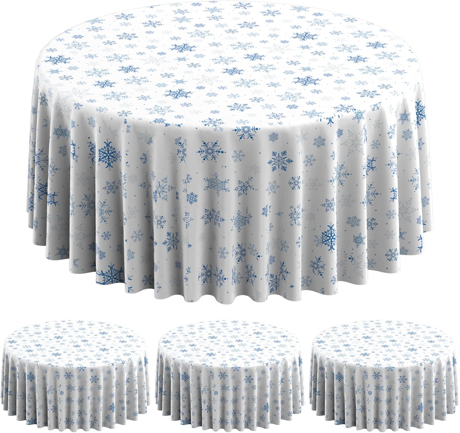 - What will you receive: 3 pieces round Christmas party tablecloth,all over printed with blue snowflake patterns on white backdrop,ideal for decorating your winter holiday and Christmas party supplies and decorations