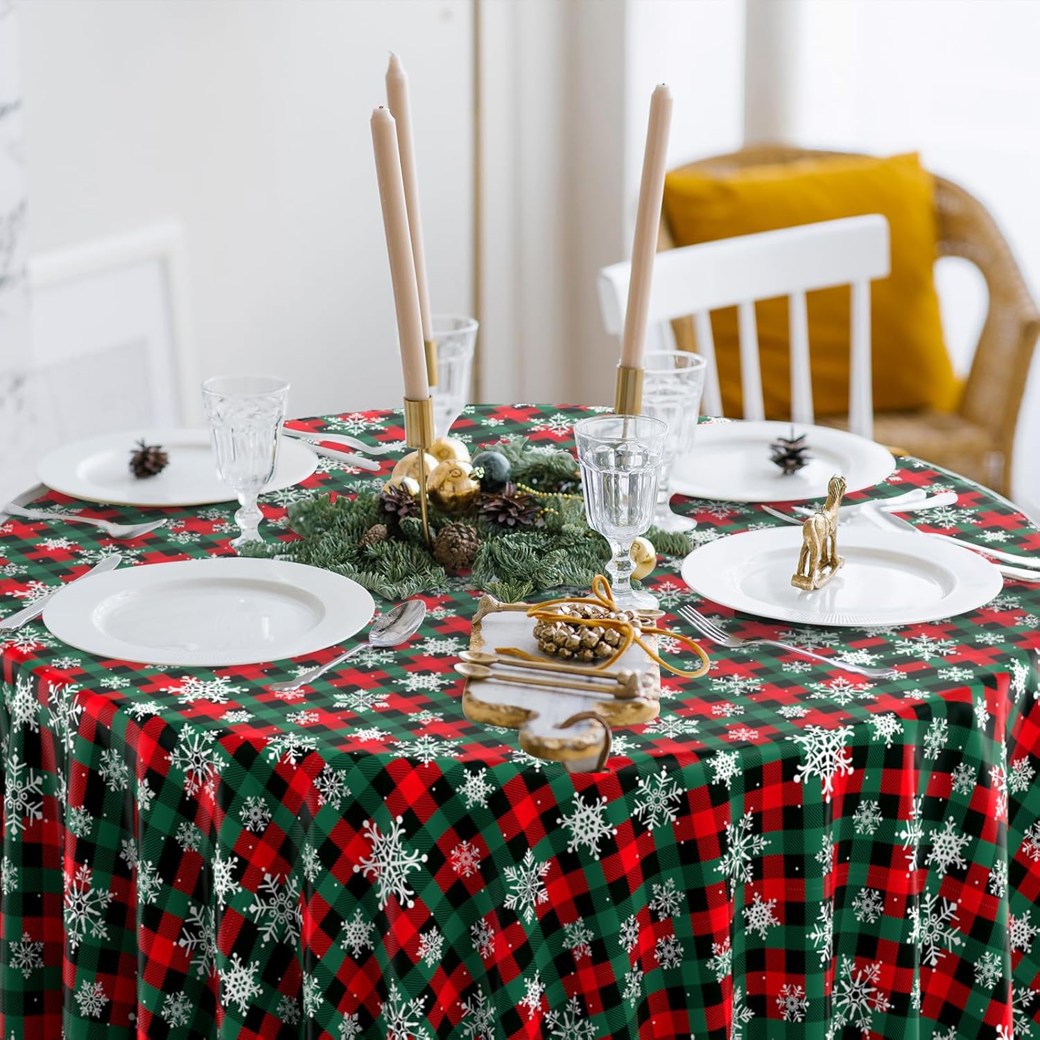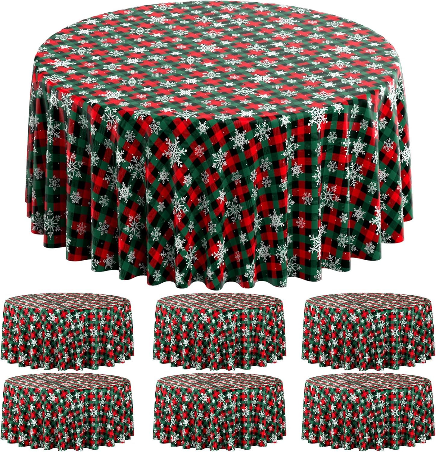 - What will you receive: 6 pieces round Christmas party tablecloth,all over printed with white snowflake patterns on red and green buffalo plaid background,ideal for decorating your winter holiday and Christmas party supplies and decorations
