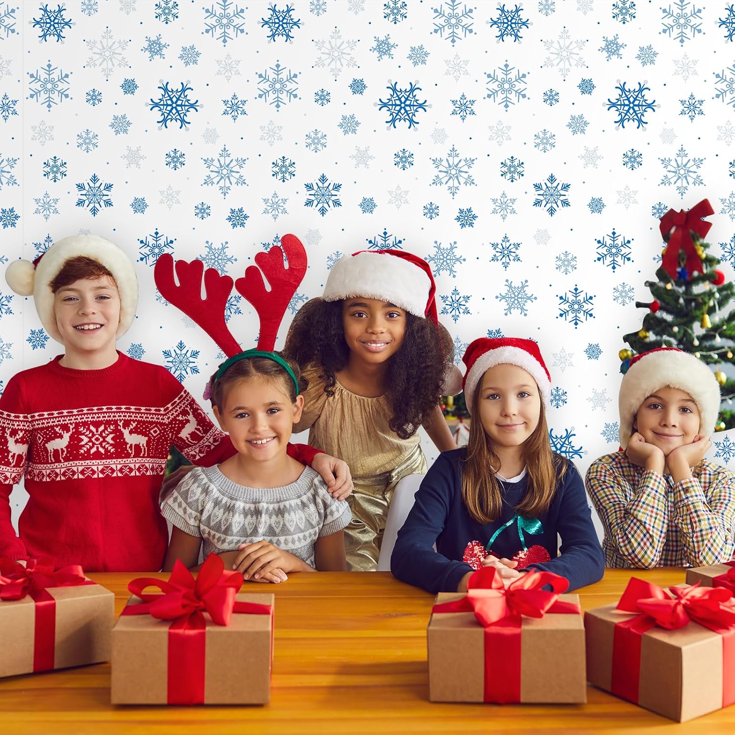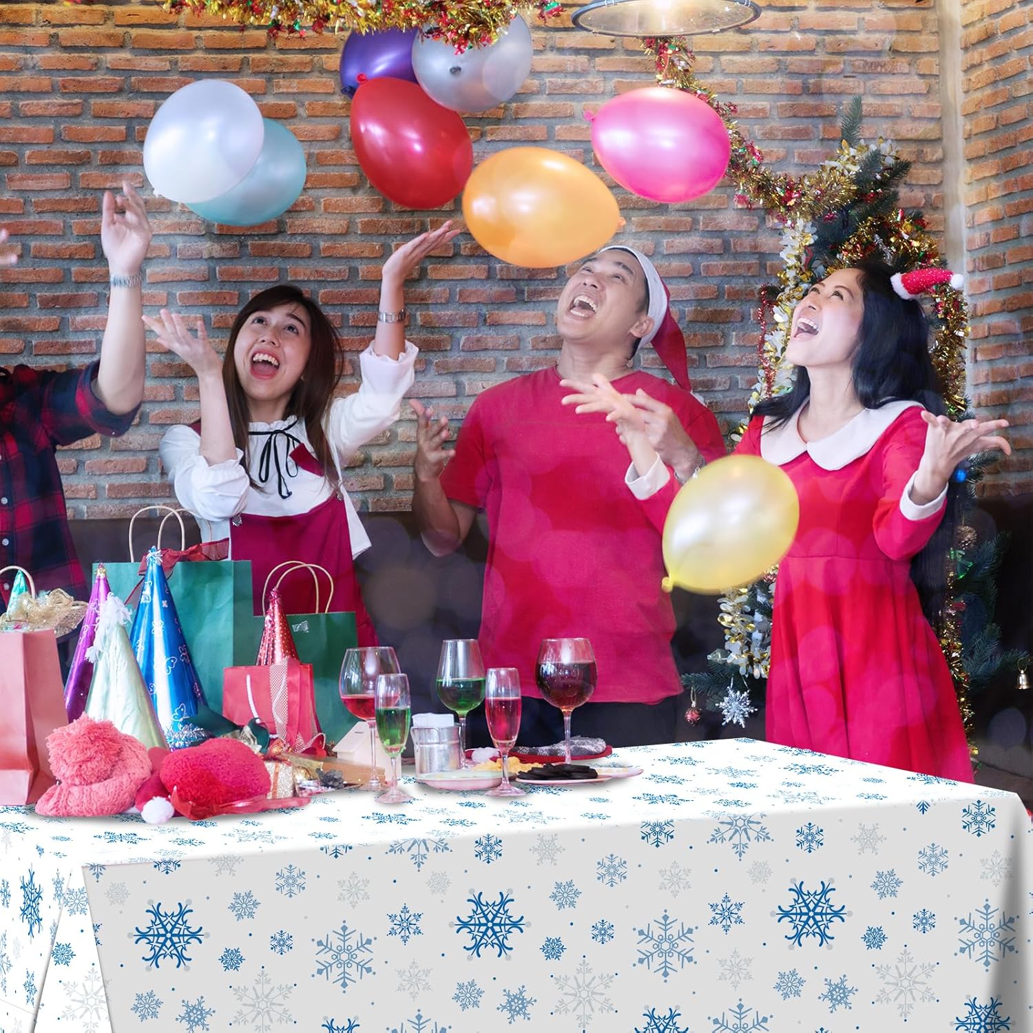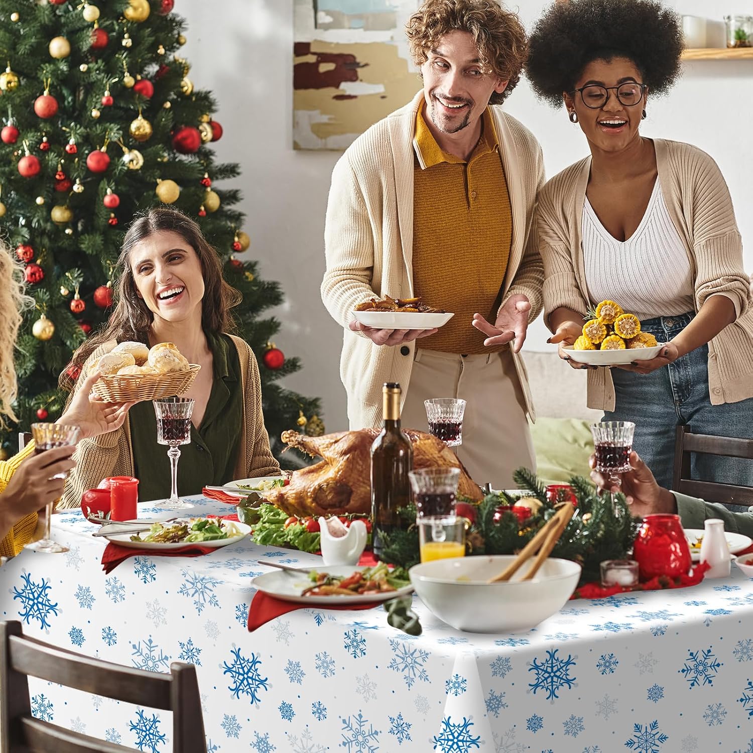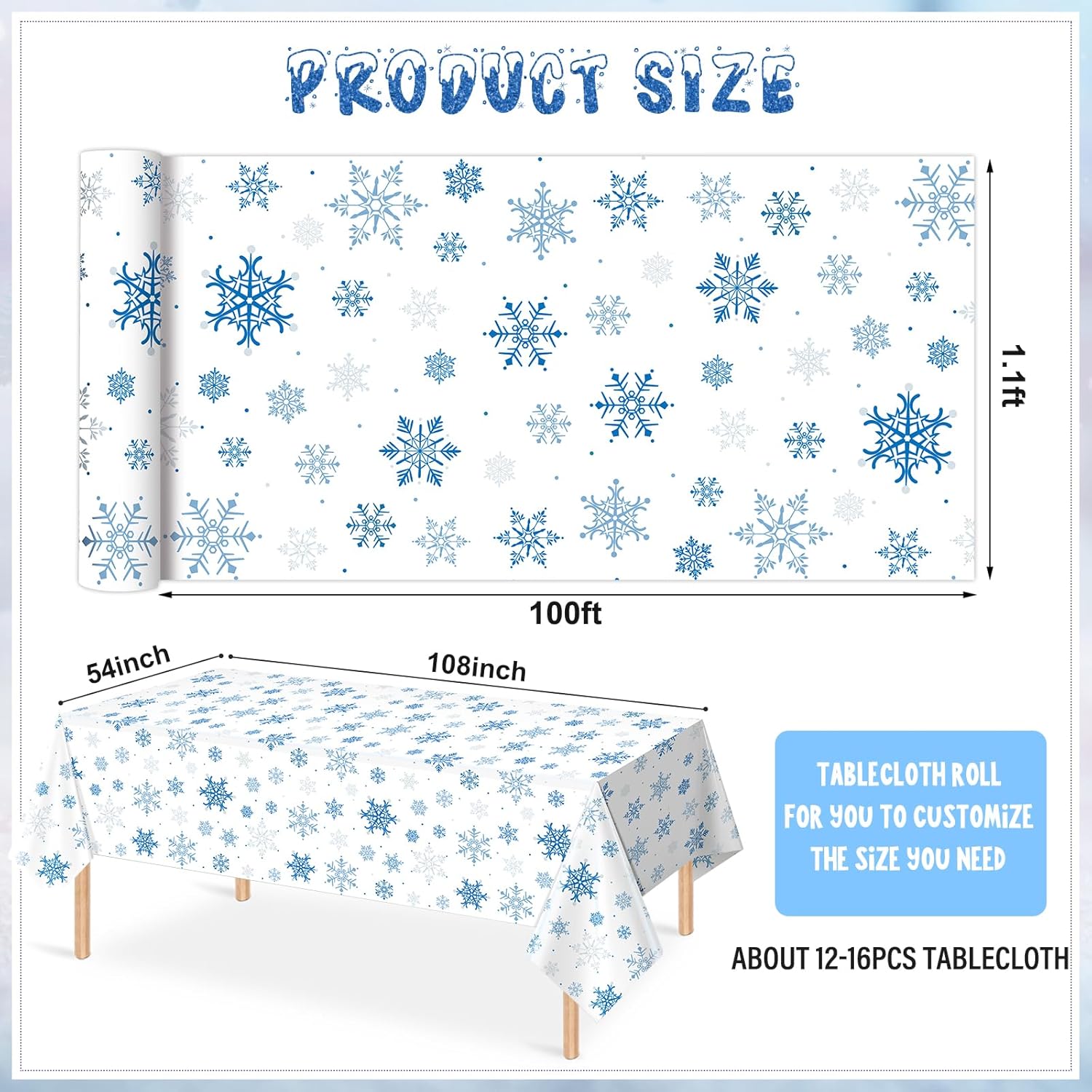 - Can be cut at will: each of blue snowflake Christmas party tablecloth measures 4.5x100 feet,fits for various-sized tables that can accommodate 8-10 people,itโs printed with eye-catching colors,making it possible for you and your guest at the party impressive.You can cut it into any shapes or length as your need,to be a tablecloth for round and rectangle table,or a background for photograph