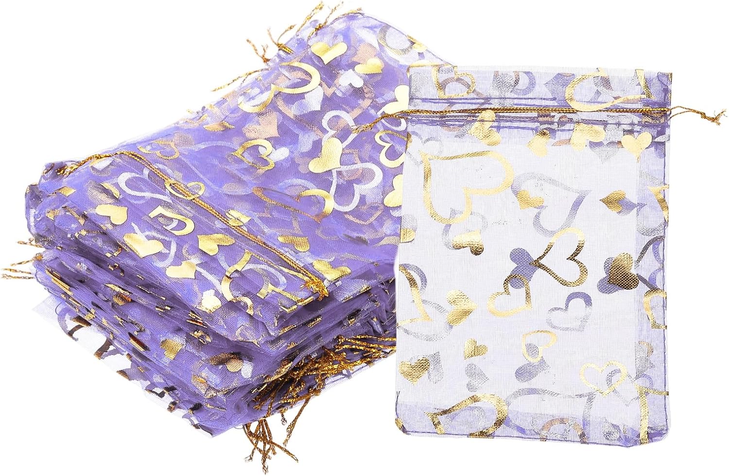 - Color: Purple; Material: Polyester; Size: 16x11 cm/6.3x4.33 Inch(L*W); Packing List: 100 Pcs x Heart Printed Organza Bags (NOTE: Please confirm the size before choosing our product)