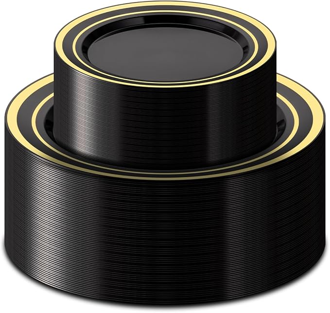 - EXQUISITE PARTY SUIT - Party plate sizes are suitable for all events. This black and gold plates set includes 50 dinner plates (10.25 inch) and 50 smaller dessert plates (7.5 inch), perfect for generous main courses and delectable desserts, cakes, and appetizers.