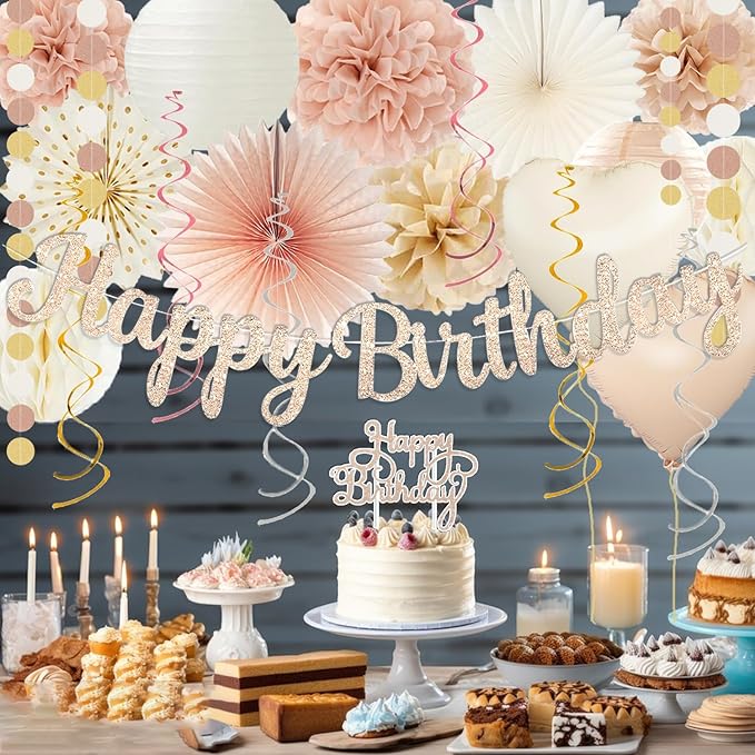 - Champagne Gold Beige Peach Birthday Kit: This complete kit includes everything you need to create an unforgettable celebration! It features a birthday banner, circle dot paper banner, 5 tissue pom poms, 2 paper lanterns, 3 paper flower fans, 40 champagne gold neutral cream Nude Latex Balloons, 6 hanging swirl streamers, and a birthday cake topper.