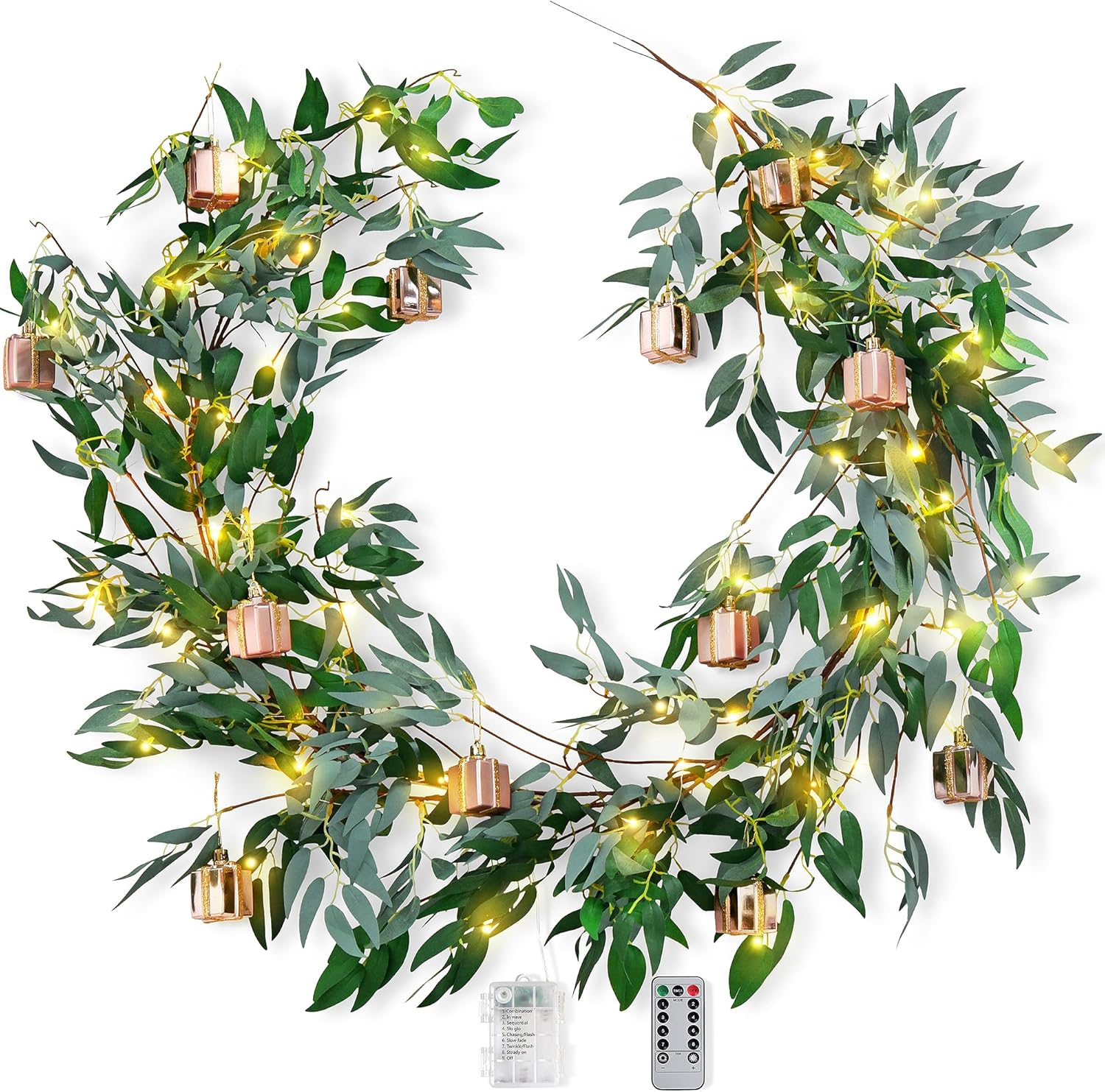 Artificial Willow Garland with Battery String Lights & Pink Gift Box Ornaments – 2-Pack Lighted Greenery Vine, with Remote for Mantels, Weddings, Fireplace, Holidays, Parties & Everyday Home Decor