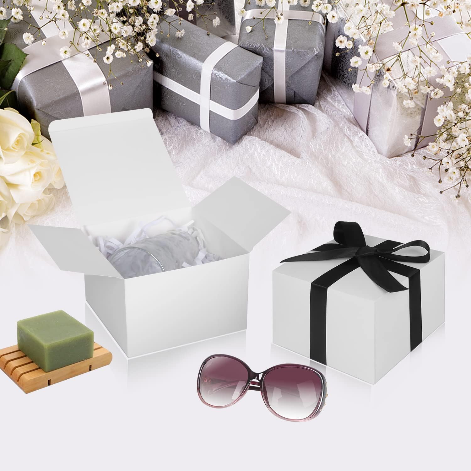 - Size:Wedding gift boxes :6"x 6"x 4" ,cube shape ,prefect size for homemade cupcakes ,candies, chocolates, cookies, jewelry, soaps ,and other small gifts.
