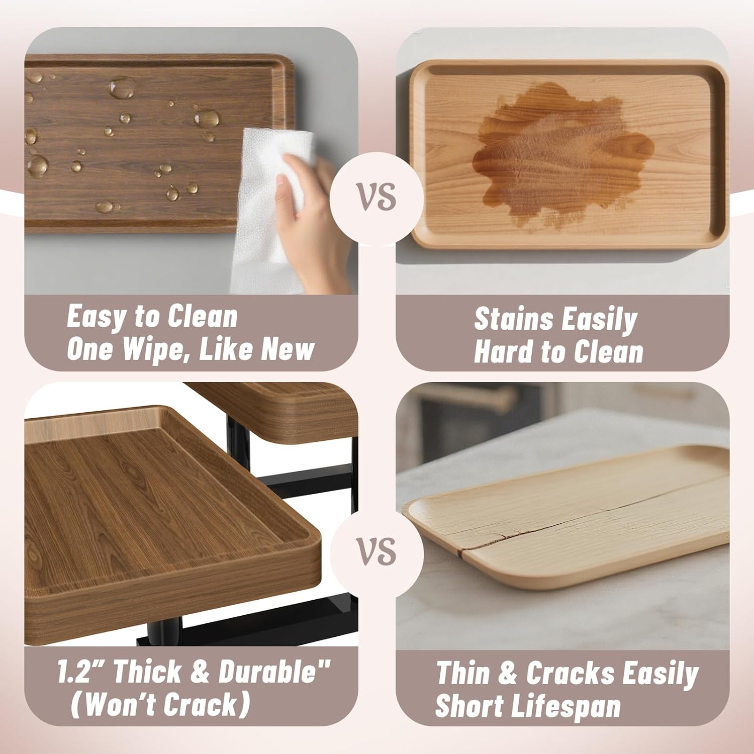 - Built to Last– Made with thick 1.2" MDF boards and a 1” thick heavy-duty metal frame, this wooden serving tray is designed to support up to 30 lbs without wobbling. Unlike flimsy stands, the solid structure resists cracking, warping, and bending, making it a reliable choice for years of entertaining.