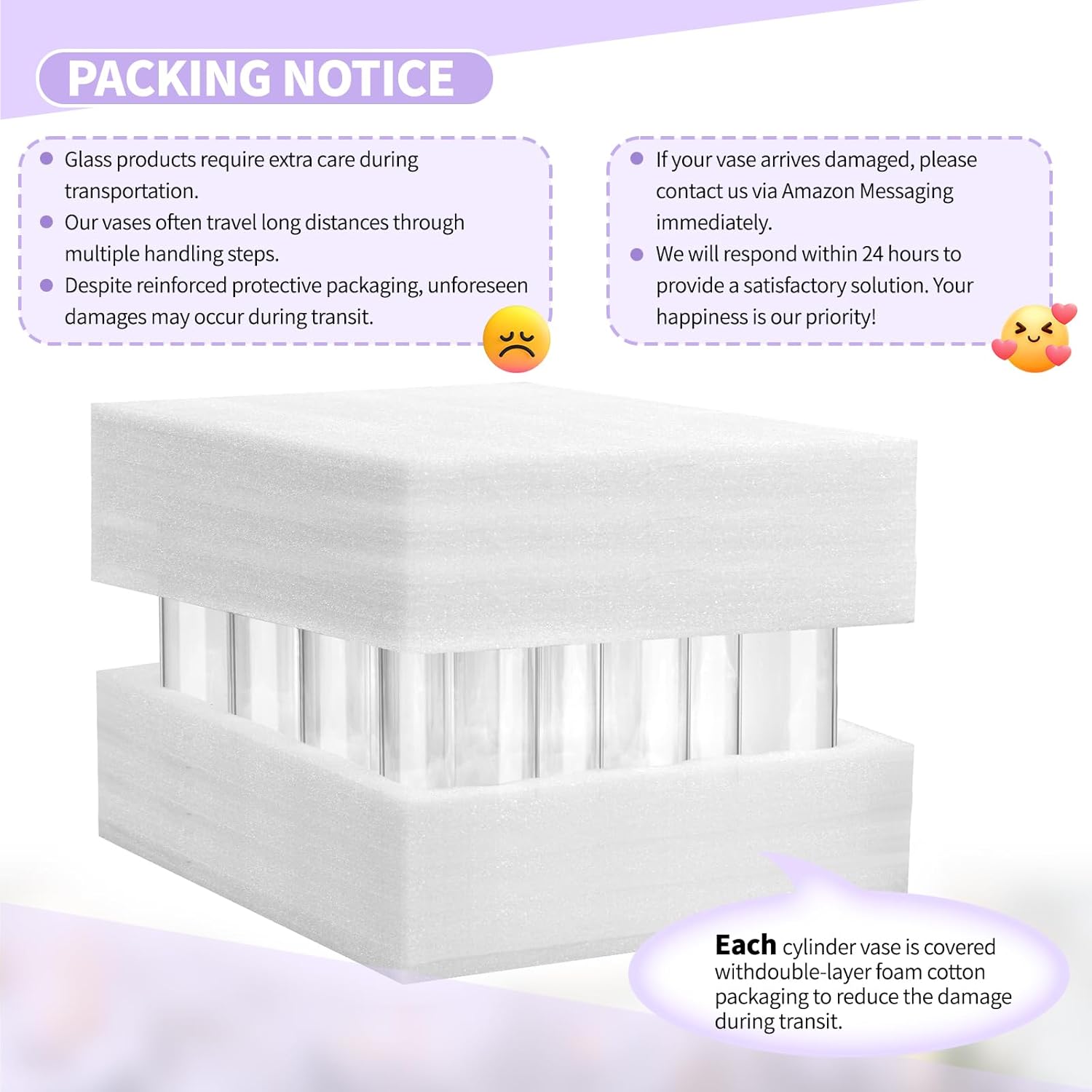 - ✅ Safe Package: Each glass cylinder vase arrives carefully protected with dual-layer foam cotton to prevent transit damage. But if anything arrives less than perfect? No worries. Just message us via Amazon—we’ll respond within 24 hours and make it right. Your happiness is our priority!