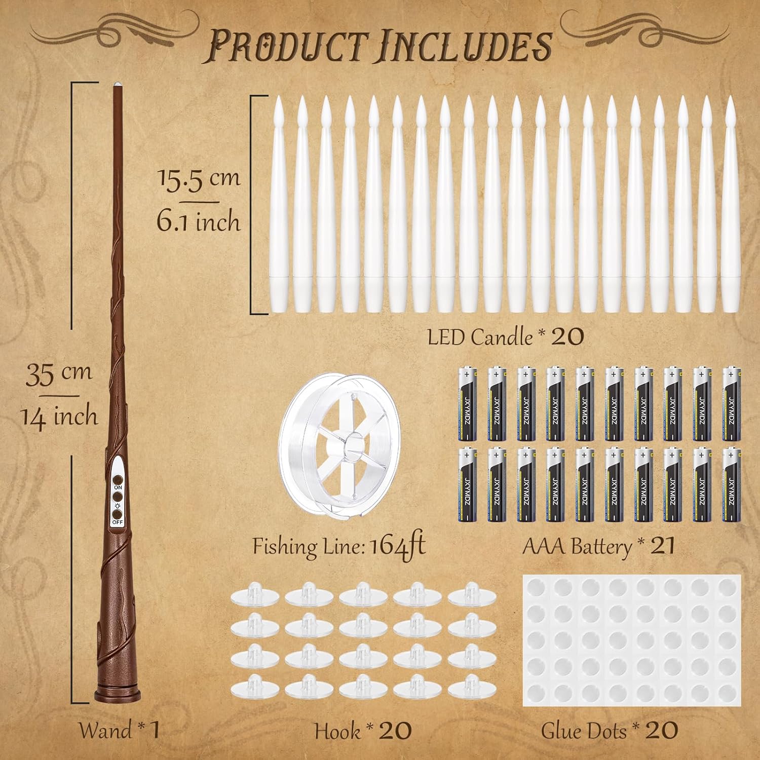 - Package List: 20* candles, 21* AAA lithium batteries, 1* fishing line, 20* glue dots, 1* magic wand, 1* user manual. We value each customer, and our after-sales team will provide each customer with satisfactory service and ensure you have the best experience possible. if you have any questions, please contact us, and we will answer you as soon as possible