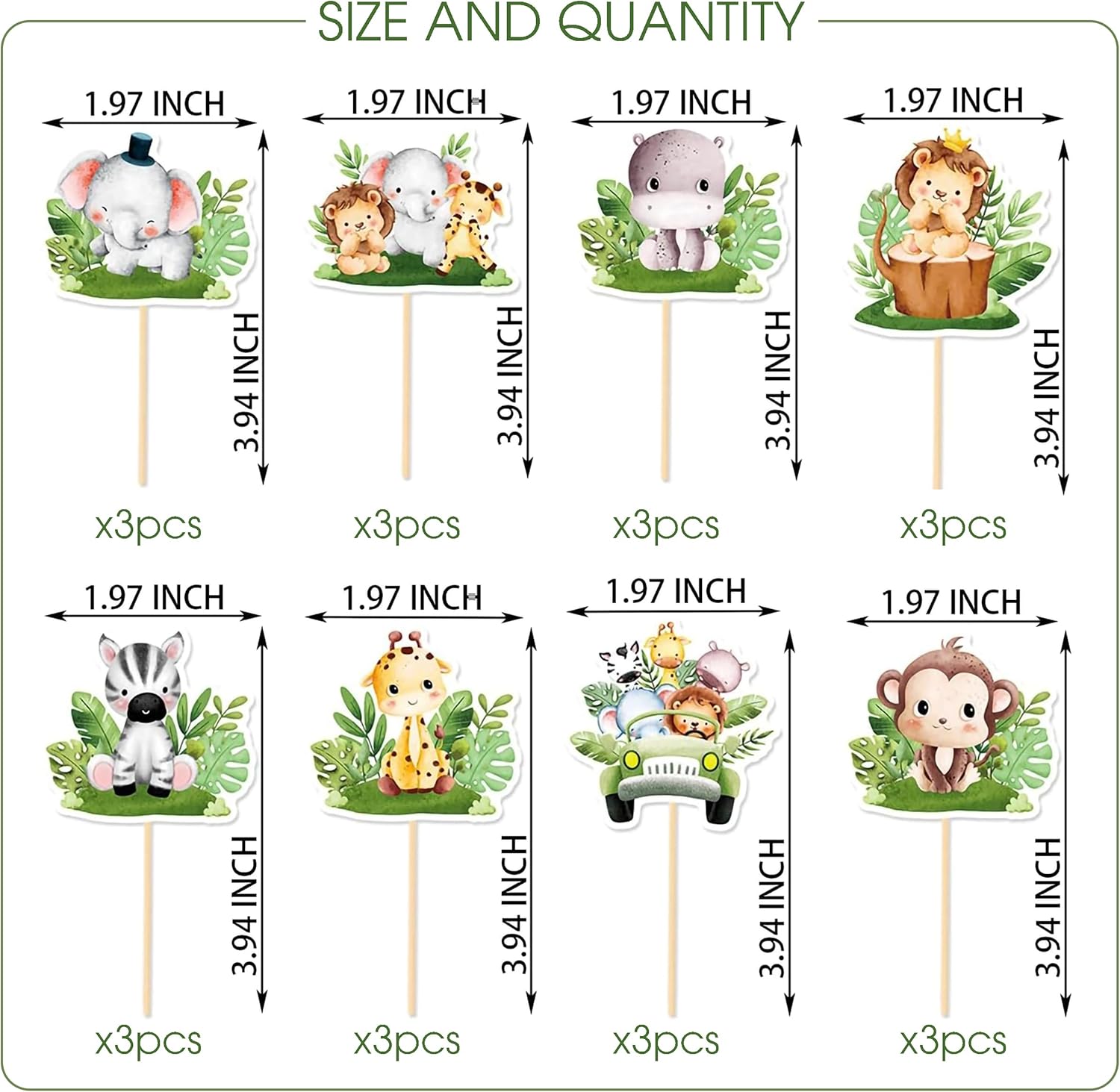 - Assorted Safari Friends: Includes 24 high-quality cupcake and cake toppers—4 each of 6 adorable jungle animal designs (lion, elephant, giraffe, zebra, monkey, hippo)—to bring the wild-one theme to life.