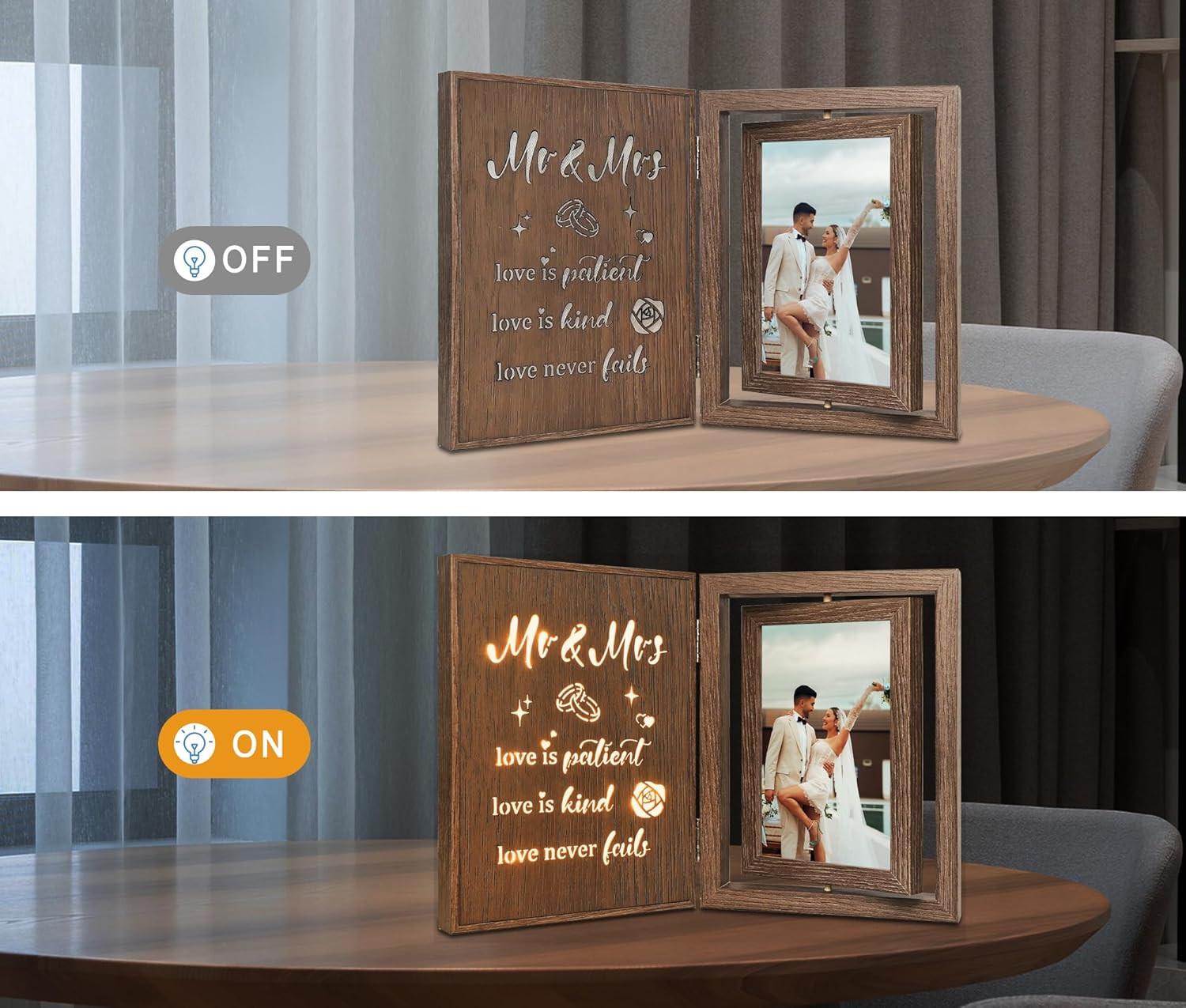 - Radiant Love & Eternal Memories – Celebrate newlyweds with our light-up wedding picture frame featuring the soft glowing MR & MRS quote: “Love is patient, love is kind, love never fails.” A heartfelt symbol of love, this wedding frame shines as a thoughtful wedding or bridal shower gift