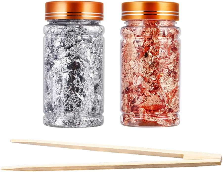 - with Wooden Tweezers: These gold flakes with tweezers come pre crushed into small, manageable pieces, our metallic foil flakes come with tweezers to help you easily pick up gold foil fragments, ensuring precise placement without any hassle; Each bottle contains 10g of flakes, with a total of 20g included in the package