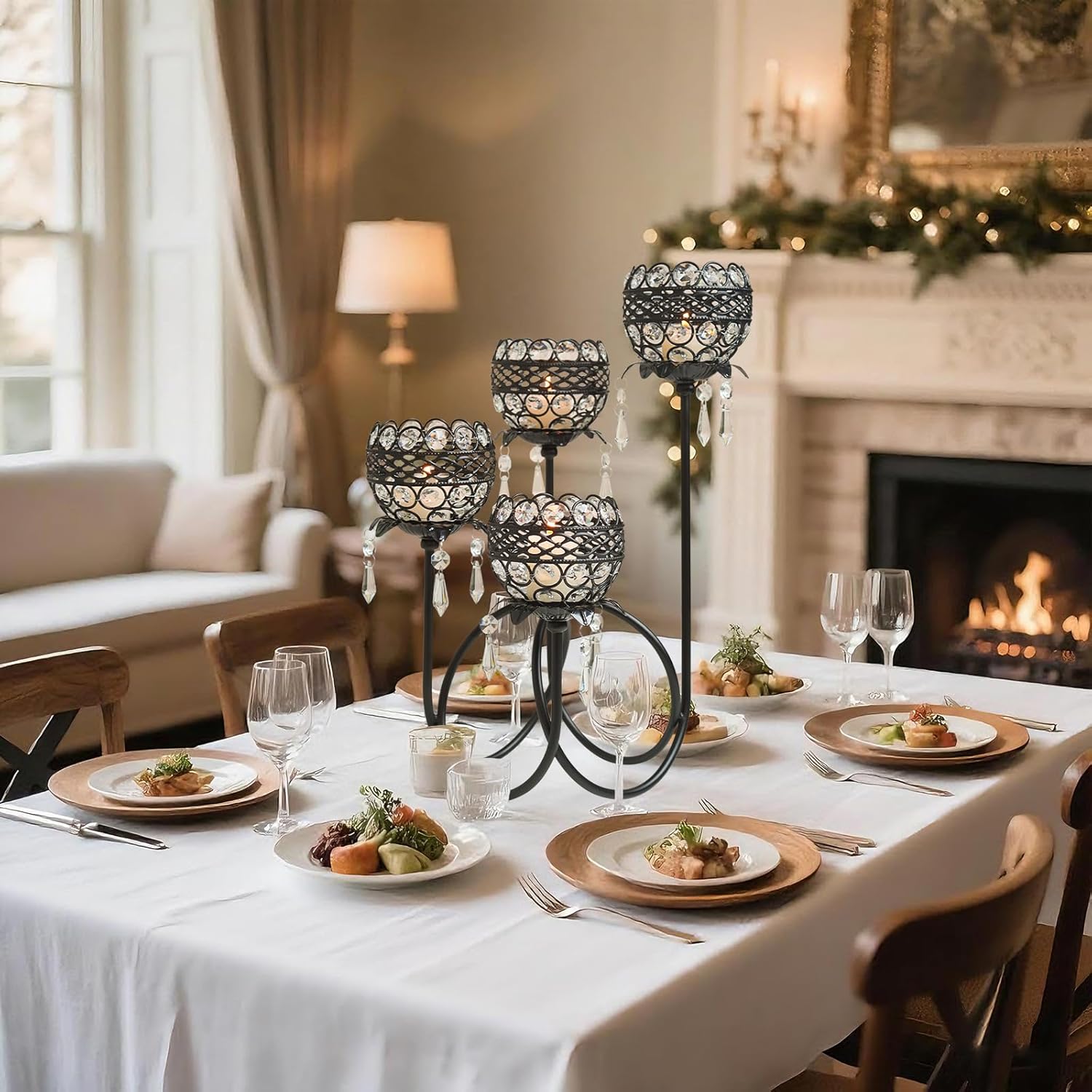 4 Arms Crystal Candelabra Tealight Holder - Tall 15.7 Inch Elegant Centerpiece with Crystal Pendant Bowls & Artistic Metal Stand for Wedding, Dining Table, Home Decor (1, Black)