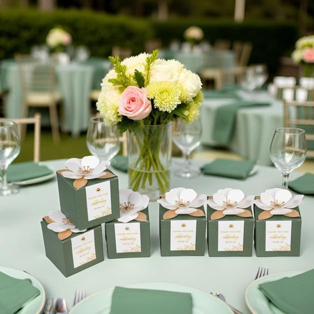 FEIYI 20 PCS Gift Boxes, 3 In 1 Olive Green Favor Boxes with Floral Decor, White Thank You Tags Cupcake Containers Gift wrapping for Wedding, Baby Shower, Birthday, Decorations Party - 3.55x3.55x3.55
