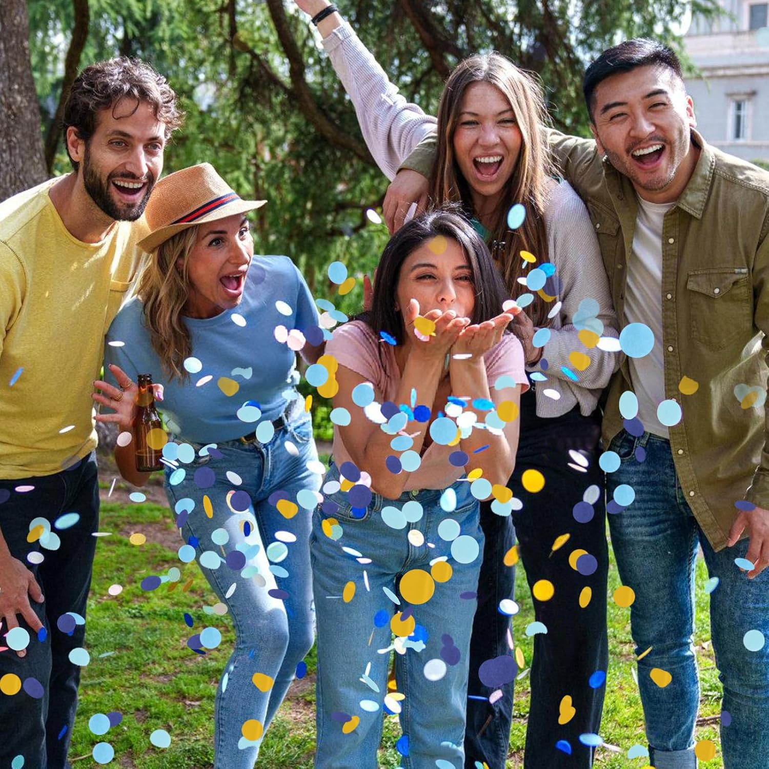 - Blue Gold confetti: Includes soft white, light blue, deep blue, gold foil, gentle cute and celebratory colors. Blue circle confetti's bright soft hues and gold foil smooth surfaces promote the visual richness and celebratory atmosphere