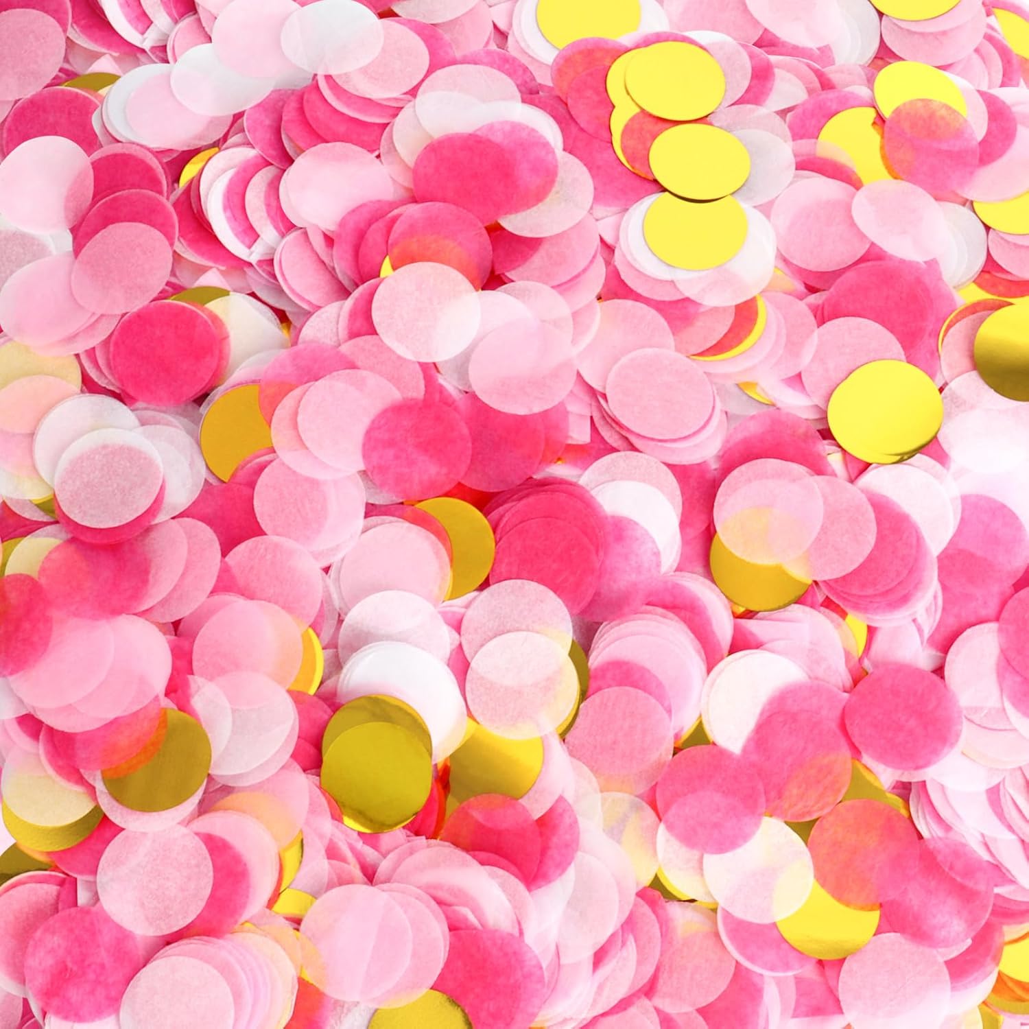 - Pink Gold confetti: Includes light pink, sky pink, sapphire pink, gold foil, gentle cute and celebratory colors. Pink circle confetti's bright soft hues and gold foil smooth surfaces promote the visual richness and celebratory atmosphere