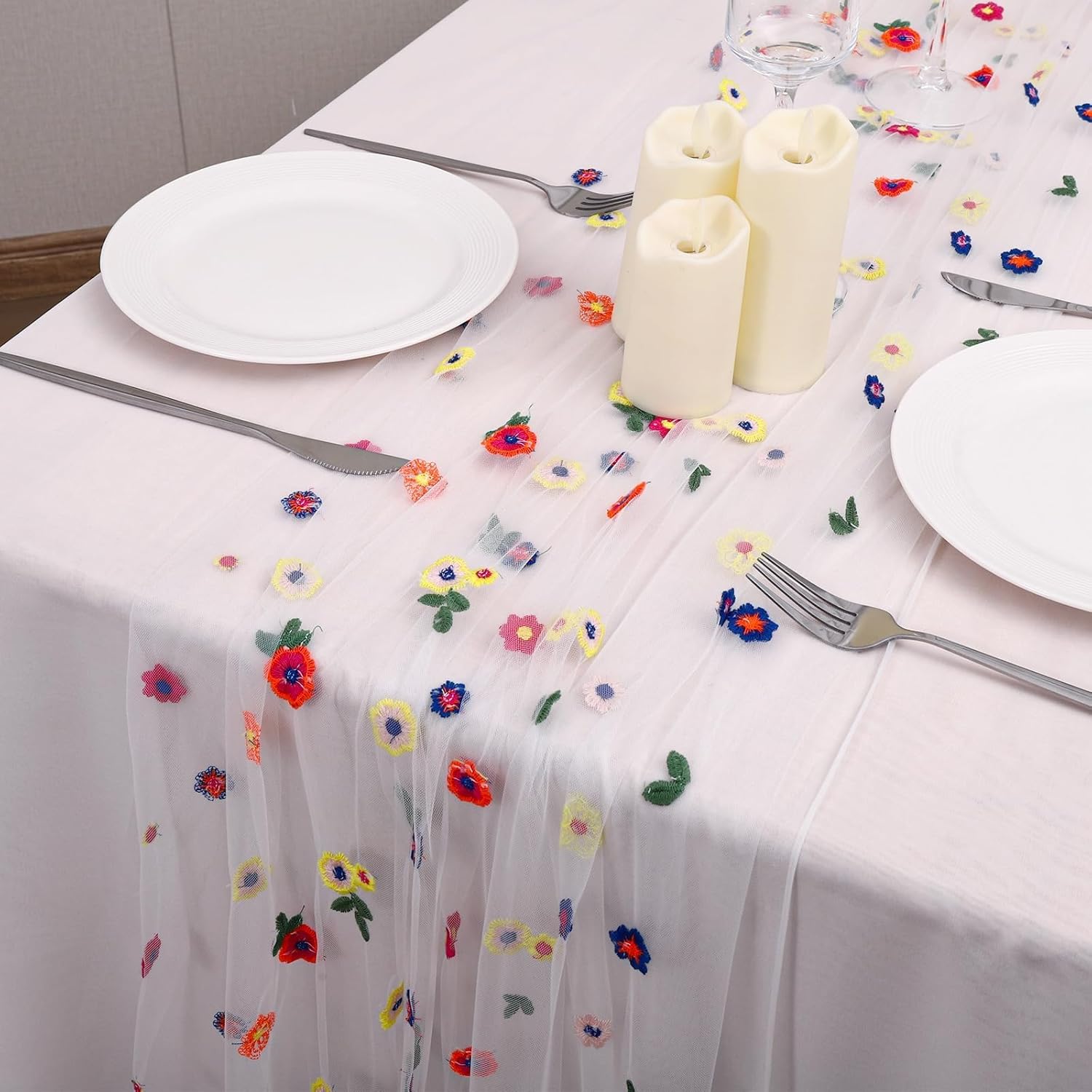 Lvory Floral Table Runner 10 FT, Embroidery Daisy Table Runners Seasonal Sheer Tulle Table Runner for Thanksgiving Wedding Birthday Baby Shower Party