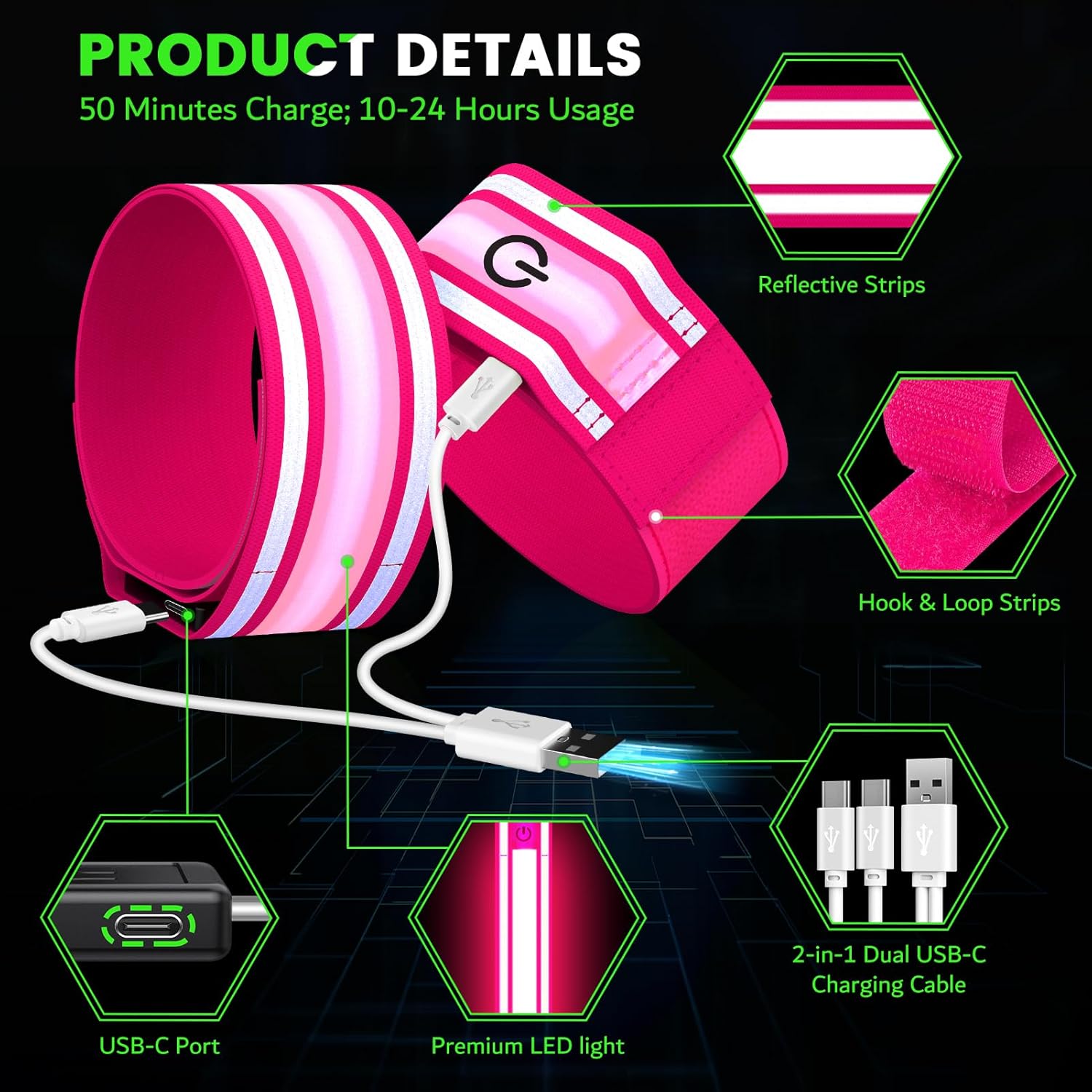 - 【Rechargeable & Long-Lasting】Say goodbye to disposable batteries! Our USB-C rechargeable armband fully charges in just 1.5 hours and lasts 20+ hours on a single charge . The dual USB-C ports let you power up from any device, while the durable lithium battery withstands sweat, rain, and daily wear.