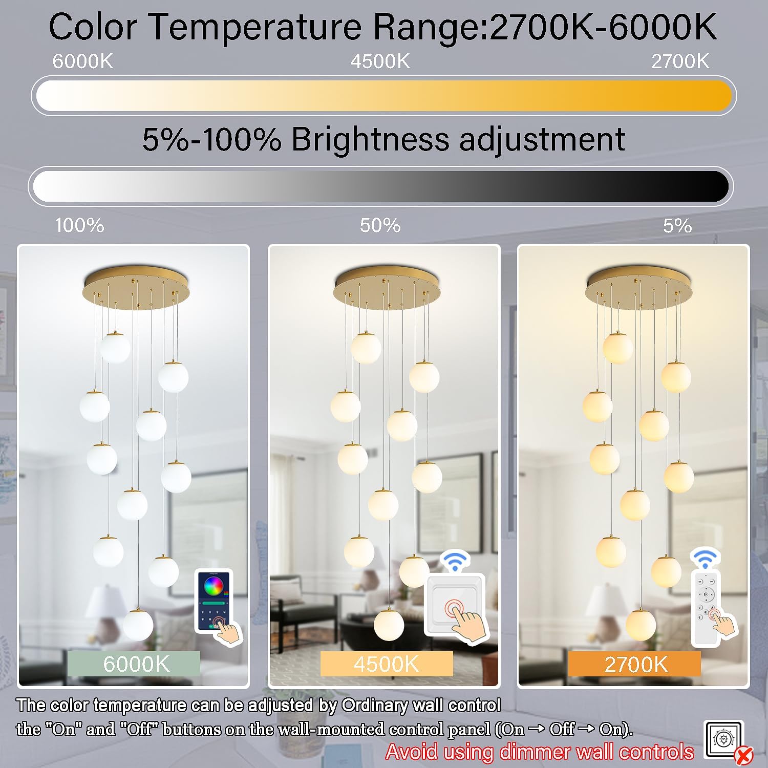 - 【Smart Hanging Chandelier 】It is equipped with a remote control and APP control for seamless dimming between warm white (2700K) and cold white (6000K), as well as adjustable brightness ranging from 5 to 100 percent.