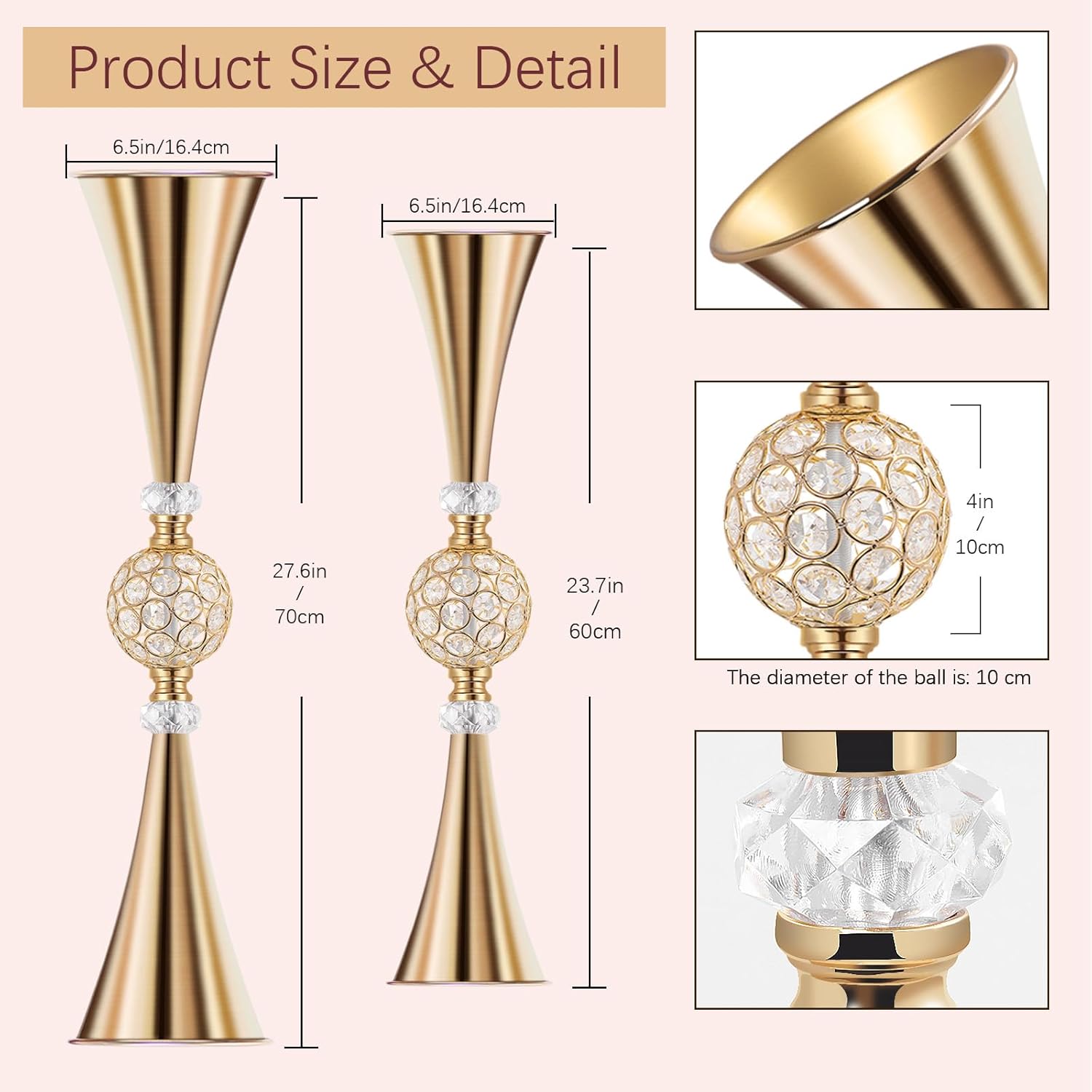- 【Dual-Size Crystal Brilliance】 Professional-Grade Sizes: Small Size - Total Height 23.7"/60cm, Top Plate Diameter 6.5"/16.4cm ; Medium Size - Total Height 27.6"/70cm, Top Plate Diameter 6.5"/16.4cm, 360° for Sweetheart Tables. Prism Effect from Sparkling Crystal Bead Ball