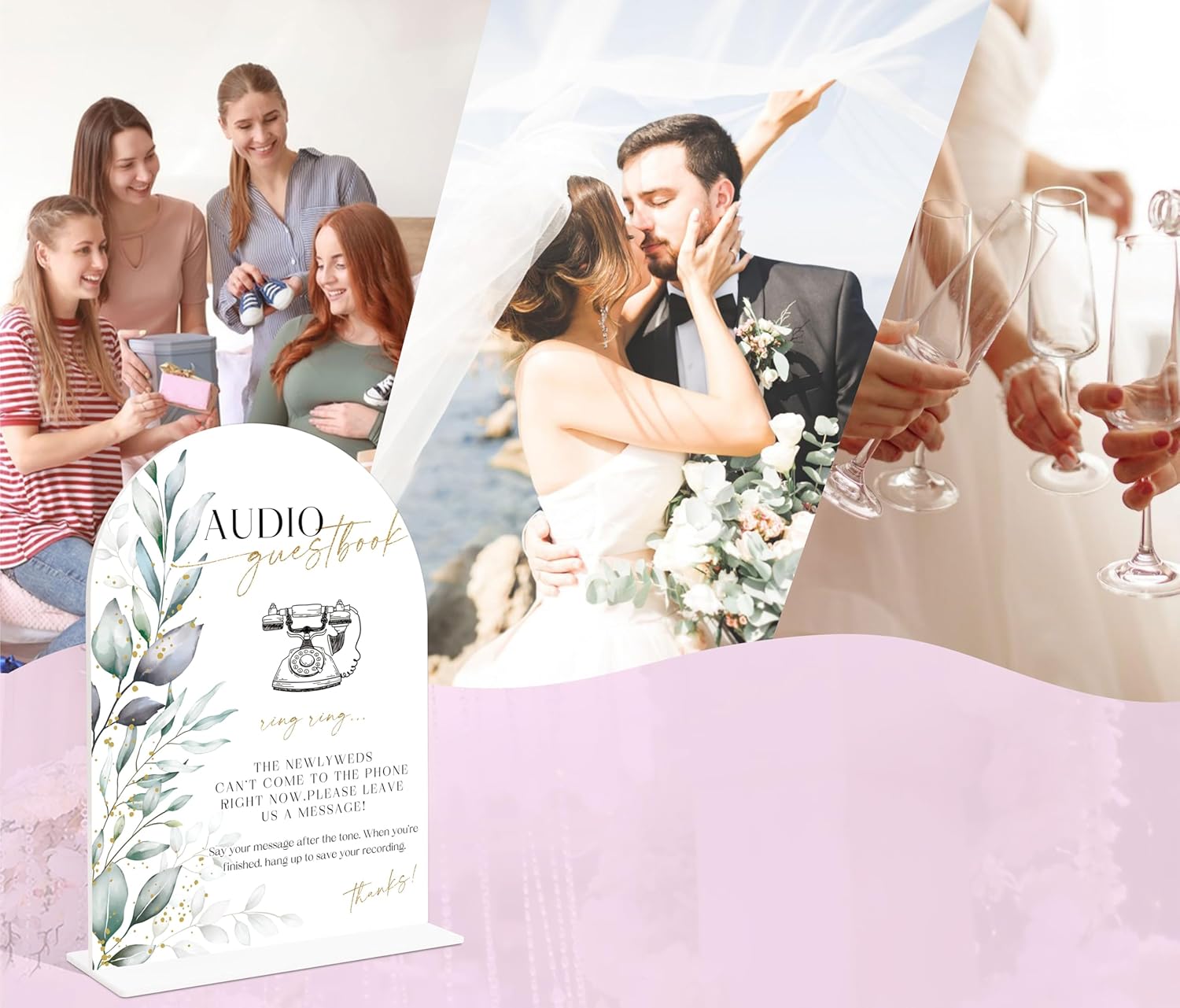 Acrylic Wedding Signs, Greenery Theme Audio Guestbook Sign, Wedding Reception Signage, Bridal Shower Table Decor with Stand, Engagement, Anniversary, Newlywed Events and Parties Supplies, 16