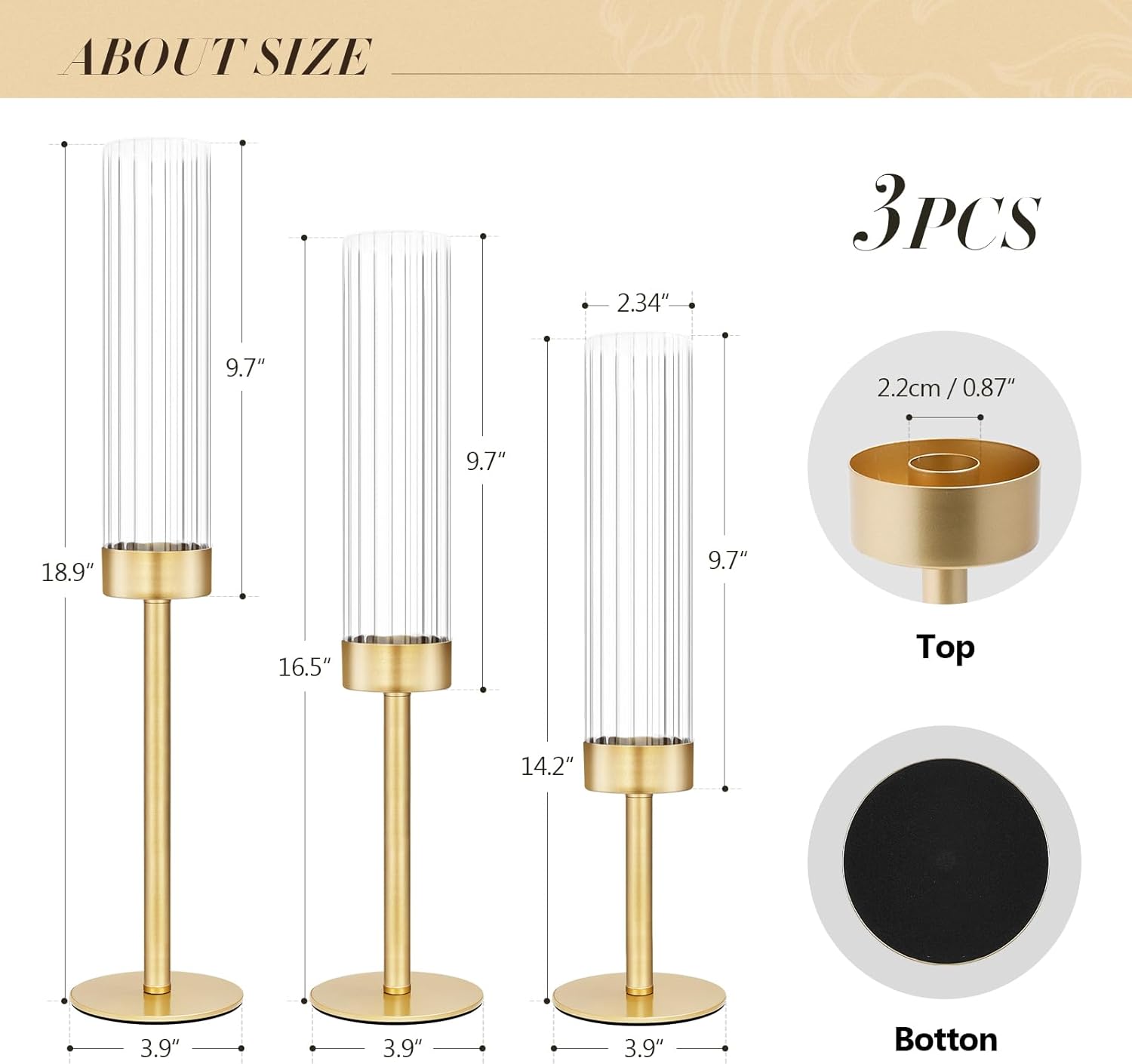 - FIT FOR 7/8 STANDARD SIZED TAPER CANDLES - Ideal Size for Decor: Set of tapered candlestick holders in 3 assorted heights: 14inches/36cm, 17nches/42cm, 19 inches/48cm (with hurricane height). The candle hole diameter measures 0.86inches/2.2cm, fits 7/8"fits standard tapered candles/ candle sticks/ flameless candles/ candlesticks!