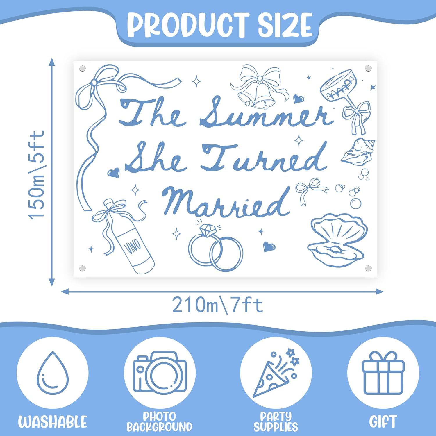 - The Summer She Turned Married Backdrop:The backdrop size is 7Γ5ft/ 210Γ150 cm. The Backdrop for Wedding, Bridal Shower, Enagement, Bachelorette Party Decoration, which will add a little sparkle to Bridal Shower party decor and bring joy to you