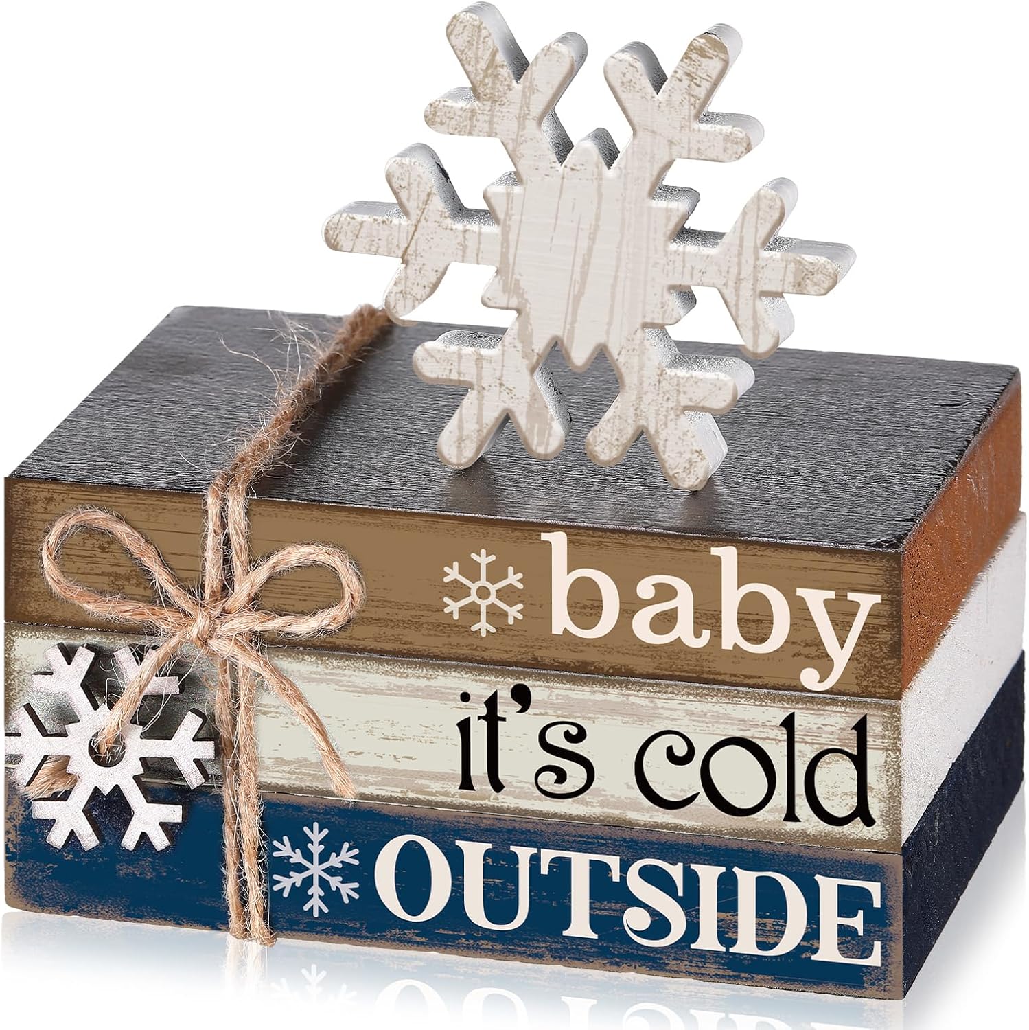 - EXQUISITE DECORATION: The set includes 4 snowflake tiered tray decorations, 3 wooden mini books, a standing wooden decoration and a piece of twine, you can tie them together by yourself and tie them with a pretty bow, they make your desktop look warmer and more beautiful.