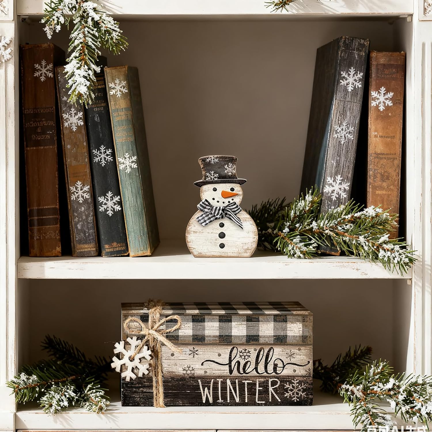 - EXQUISITE DECORATION: The set includes 4 snowman tiered tray decorations, 3 wooden mini books, a standing wooden decoration and a piece of twine, you can tie them together by yourself and tie them with a pretty bow, they make your desktop look warmer and more beautiful