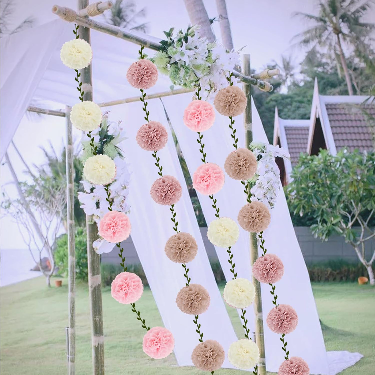 - [Packaging includes] 3x 6 inches Nude pink tissue paper pompoms, 3x 6 inches Rose pink tissue paper pompoms, 3x 6 inches Linght pink tissue paper pompoms, 3x 6 inches Beige tissue paper pompoms, 2x 6.6FT Vine garland banner