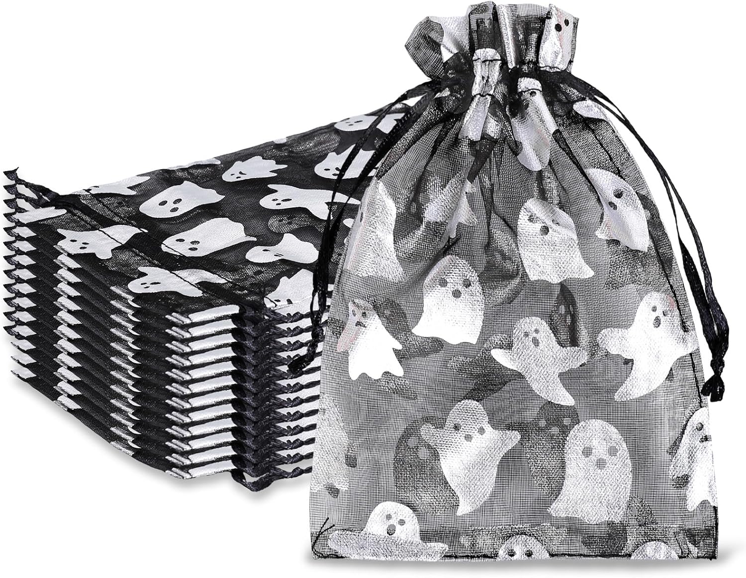 Whaline 100Pcs Halloween Organza Drawstring Bags Cute Foil Silver Ghost Jewelry Gift Bag 4''x6'' Small Mesh Favor Bags for Trick or Treat Birthday Baby Shower Party Supplies
