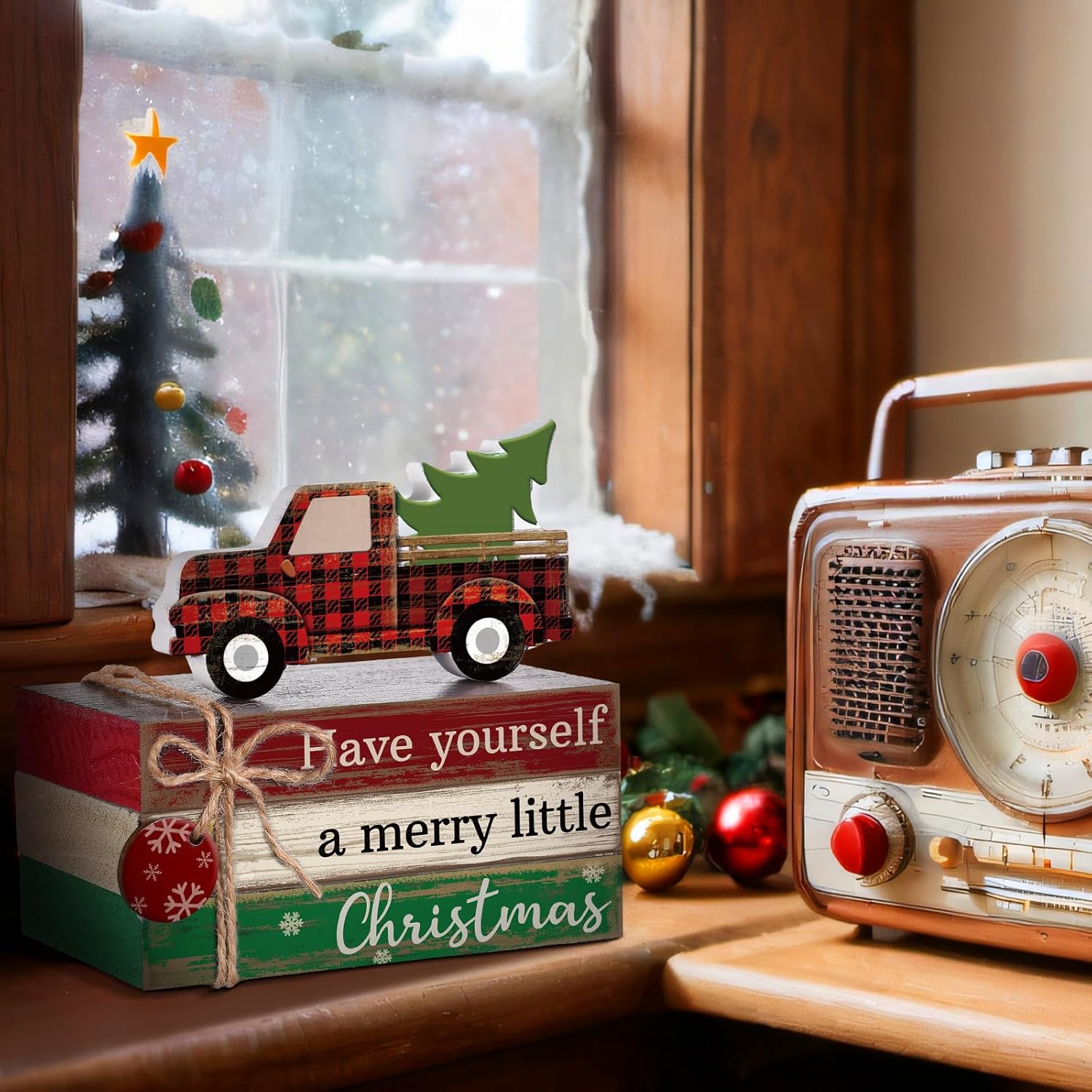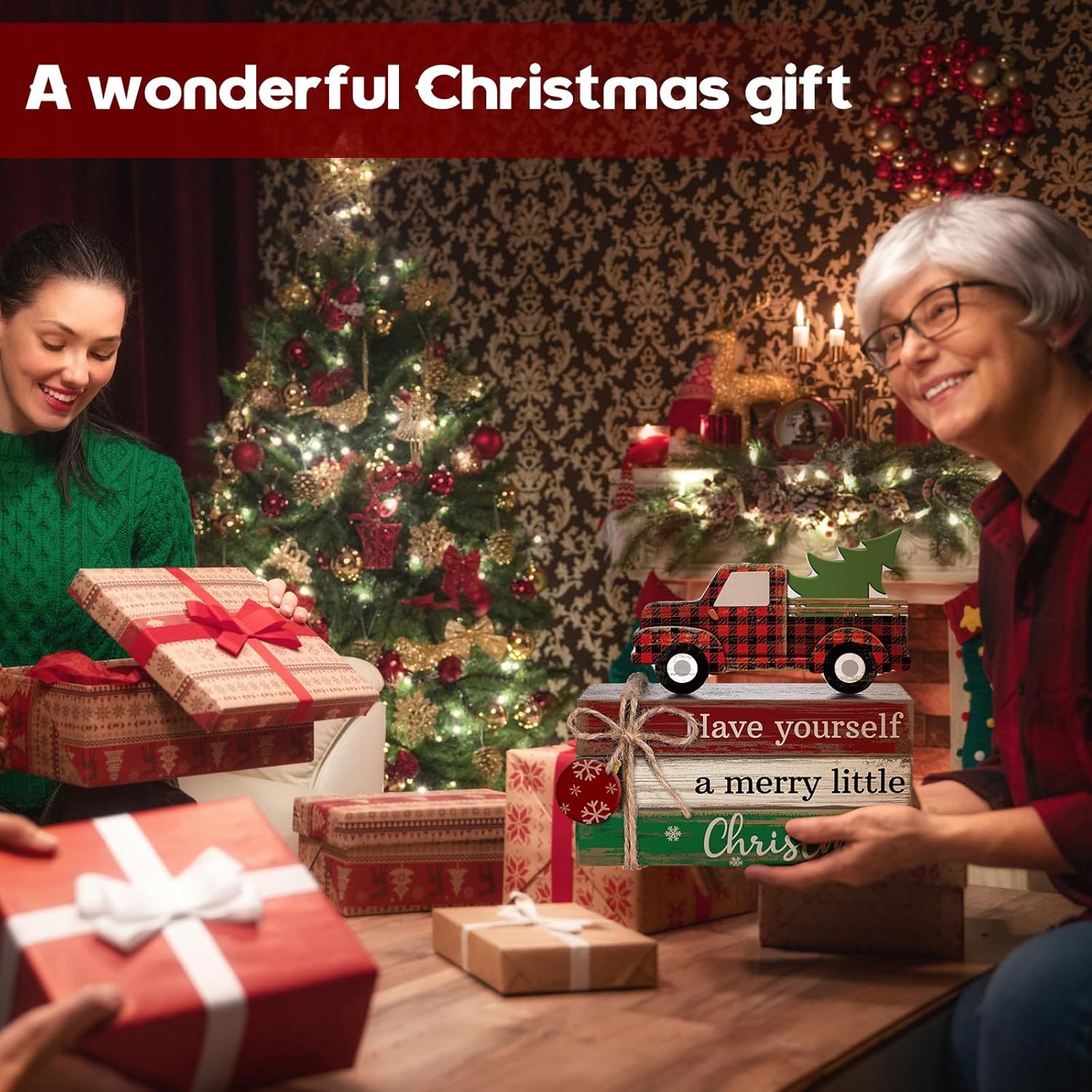 4 Pcs Christmas Table Decor Winter Table Decorations Christmas Tiered Tray Decor Decorative Truck Book Decorations Indoor Rustic Wooden Snowflake Block Sign Gift Farmhouse for Home Shelf