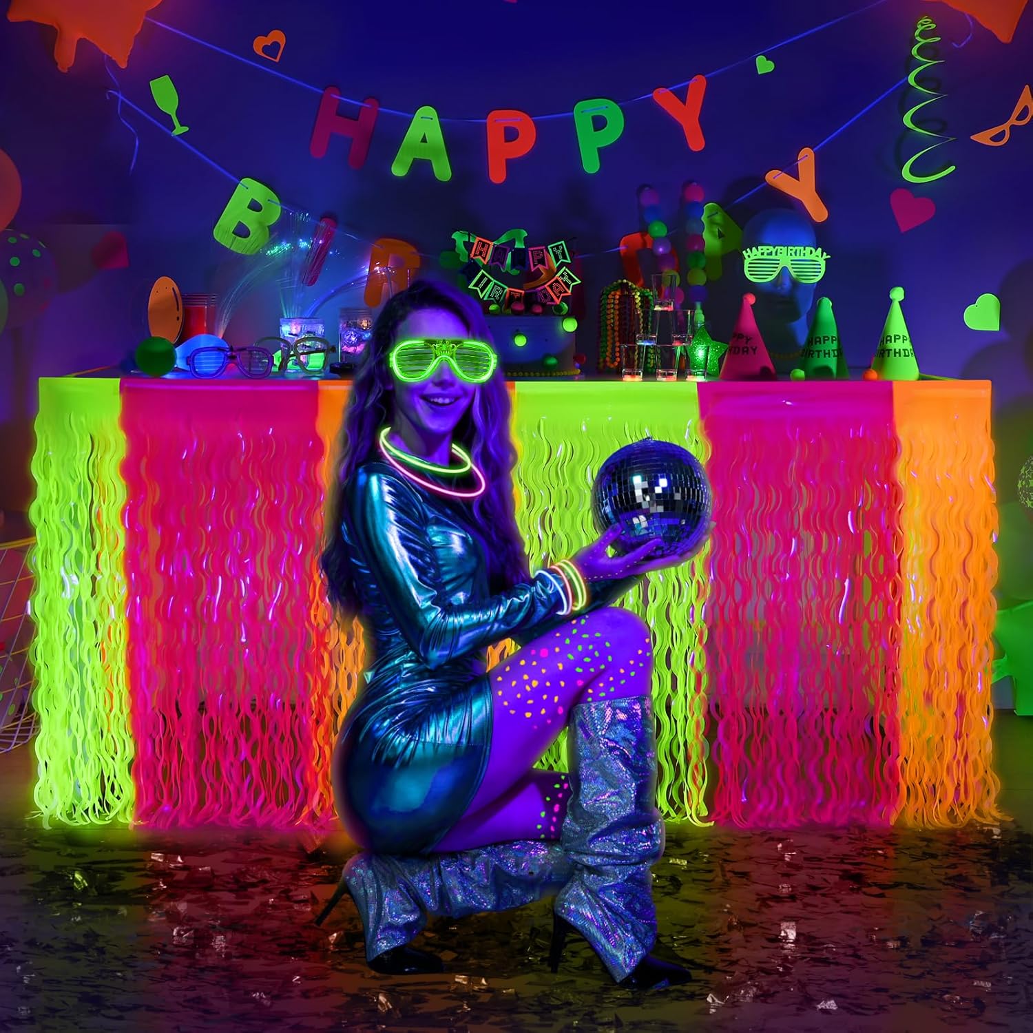 - 【 WIDELY APPLICATIONS】: Our glow in the dark neon foil fringe table skirts are perfect for neon birthday party, dessert table decoration,suitable for both rectangular and round tables. You won't regret choosing this table skirts to make your table the center of the party.