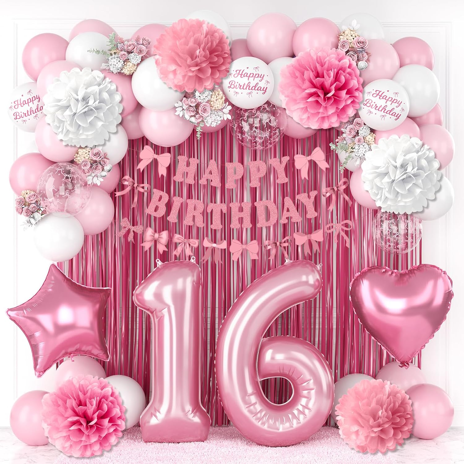 - PACKAGE INCLUDES: 1pc pearl pink number 16 balloon, 1pc bow happy birthday banner, 2pcs pink paper pom poms, 2pcs light pink paper pom poms, 2pcs white paper pom poms, 1pc pink curtain, 1pc light pink star foil balloons, 1pc light pink heart foil balloons,6pcs light pink balloons, 6pcs pastel pink balloons, 4pcs white balloons, 2pcs birthday printed balloons, 2pcs bow clear balloons, 1pc ribbon