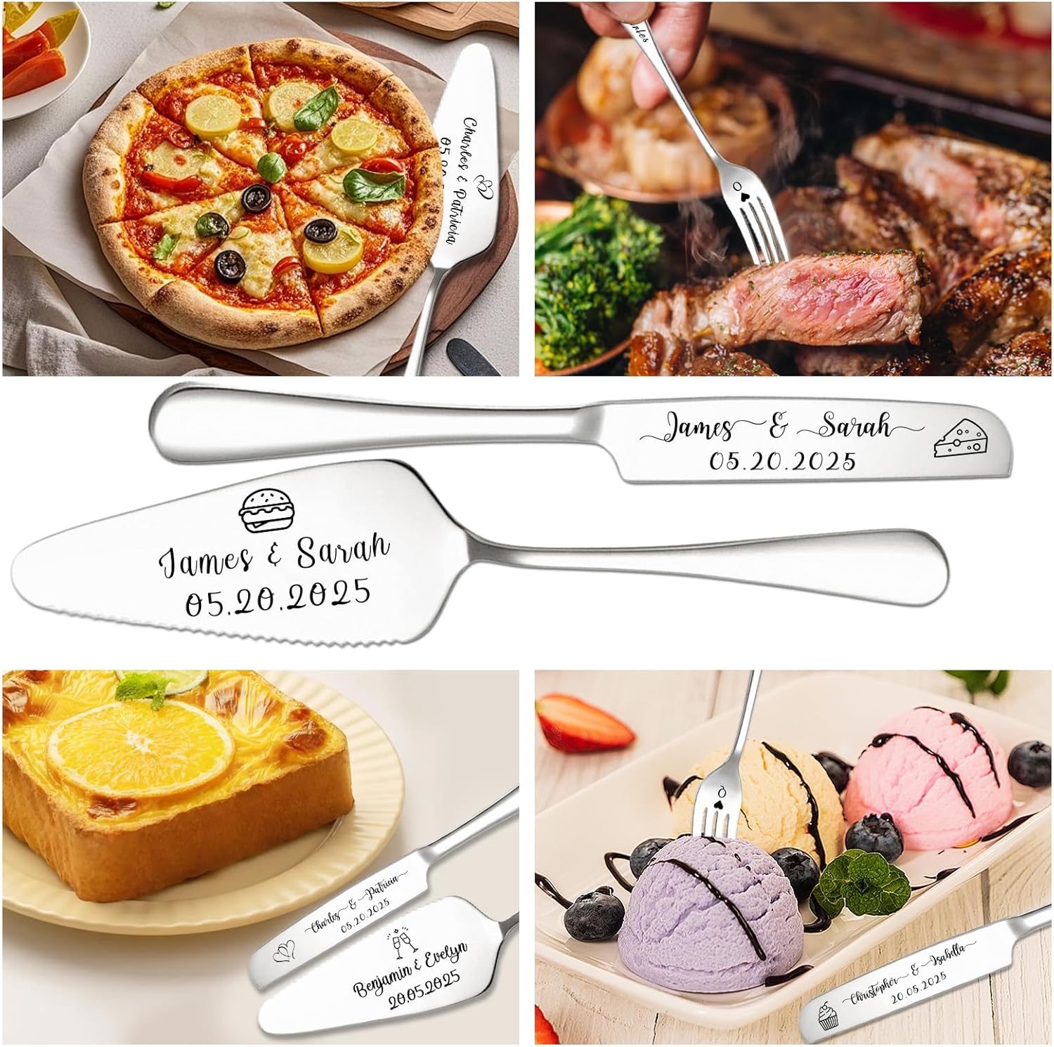 - Cake Knife and Server Set: The personalized cake cutting set adopts a multifunctional design and is also suitable for daily use. Its wavy blade with a triangular shovel surface can not only neatly cut out multi-layered desserts, but also firmly hold up block-shaped food. Whether it is a wedding cake, fruit pie, pizza, pancakes, omelets, etc., it can make every meal full of ritual