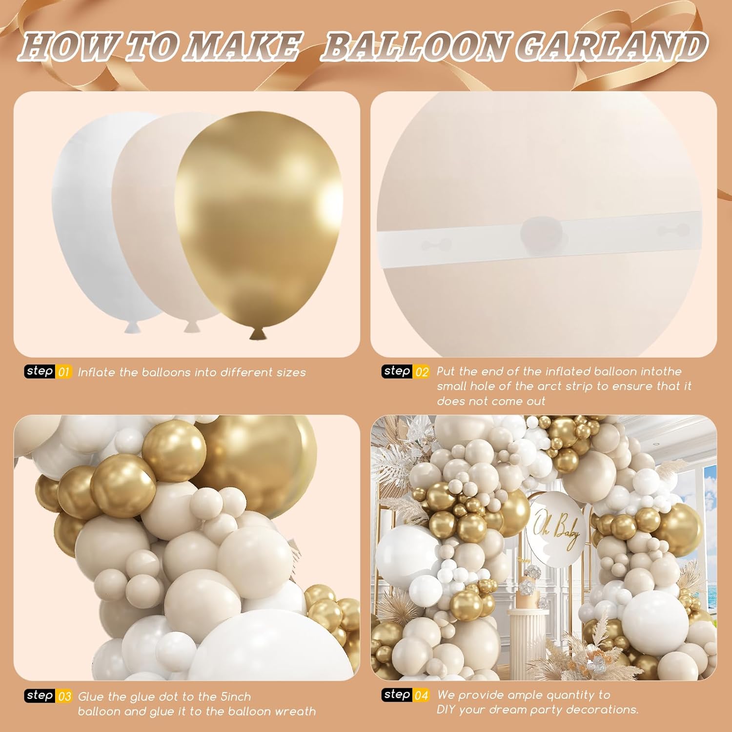 - Package List : neutral balloon arch kit includes 18" Sand White/White/Metallic Gold balloons(12 pcs), 12" Sand White/White/Metallic Gold balloons(100 pcs), 10"Sand White/White/Metallic Gold balloons(100 pcs), 5" Sand White/White/Metallic Gold balloons(100pcs),glue dotsx200, ribbonx2, decorative stripx2. plenty in quantity.