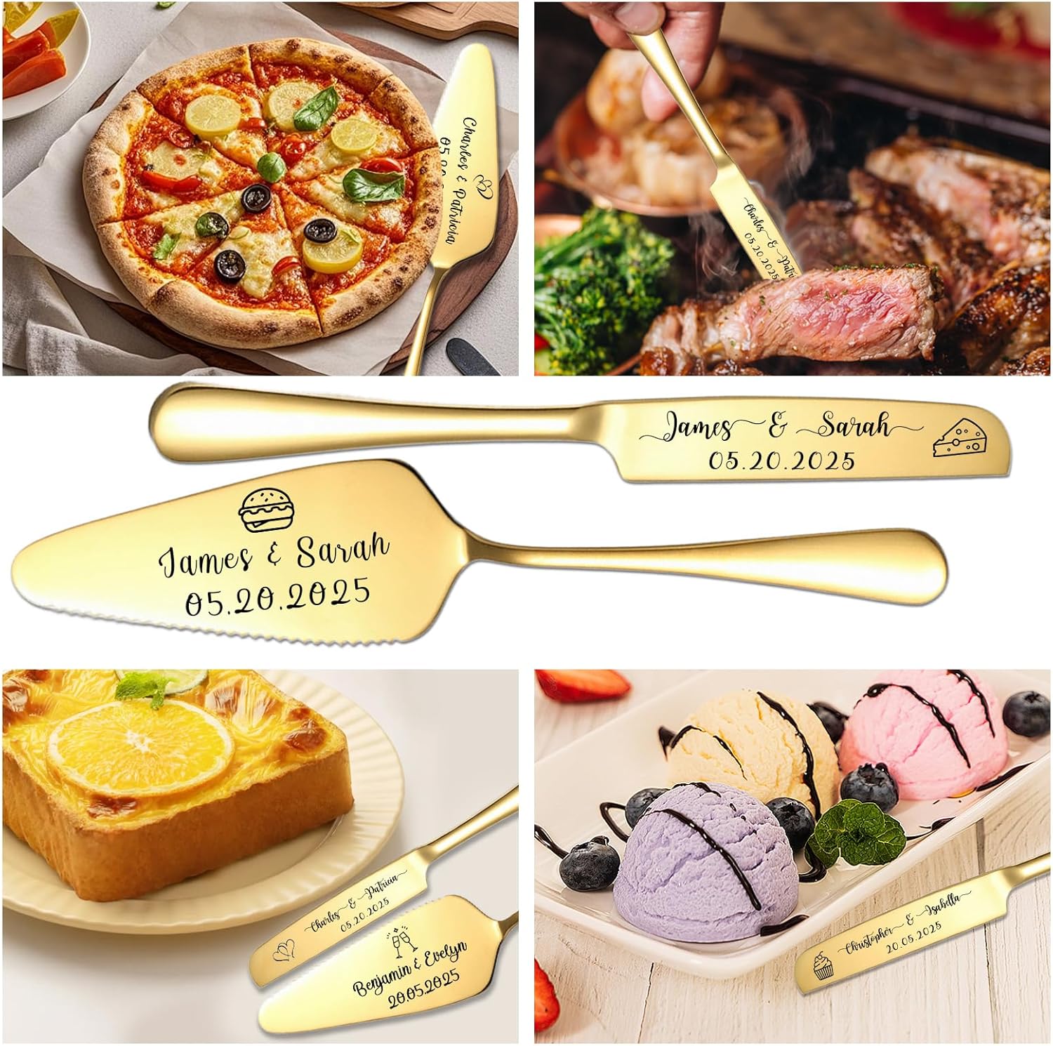 - Cake Knife and Server Set: The personalized cake cutting set adopts a multifunctional design and is also suitable for daily use. Its wavy blade with a triangular shovel surface can not only neatly cut out multi-layered desserts, but also firmly hold up block-shaped food. Whether it is a wedding cake, fruit pie, pizza, pancakes, omelets, etc., it can make every meal full of ritual